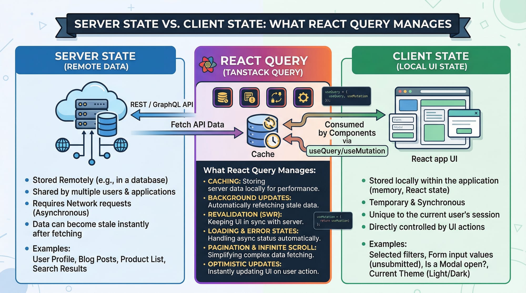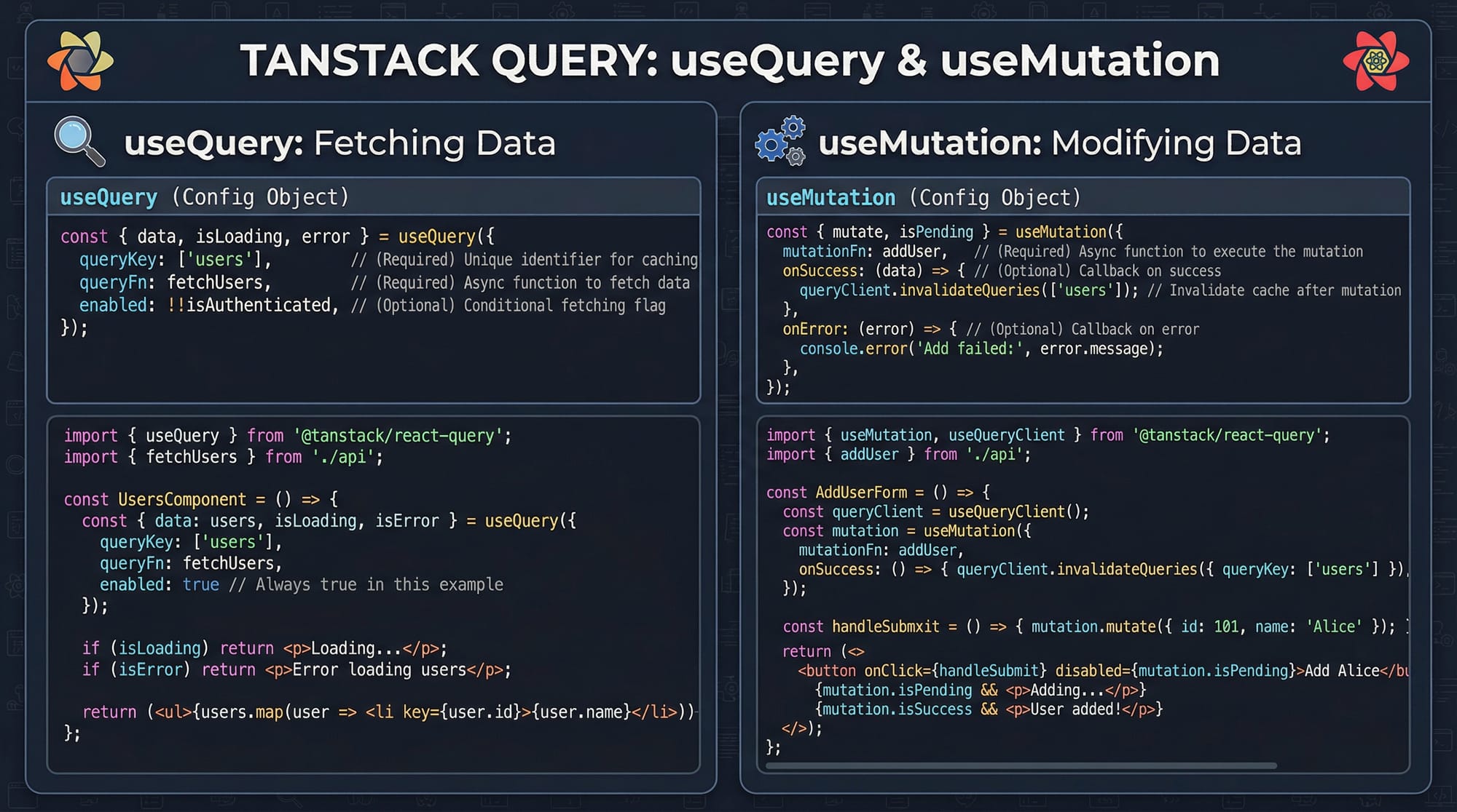 useQueryis used for fetching datauseMutationis used for updating data- Automatic caching improves performance