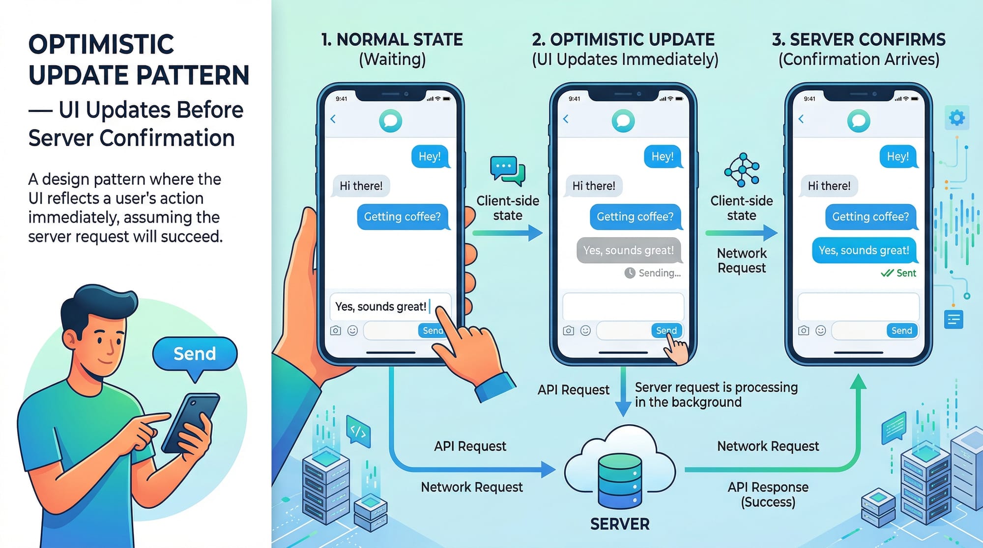 - Client State → Managed locally (e.g., form inputs, UI toggles)