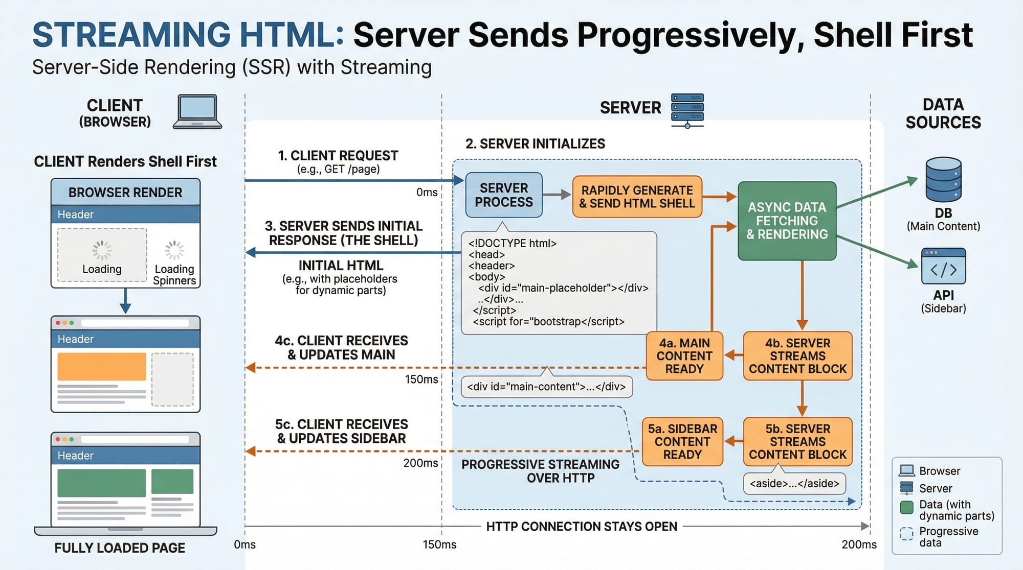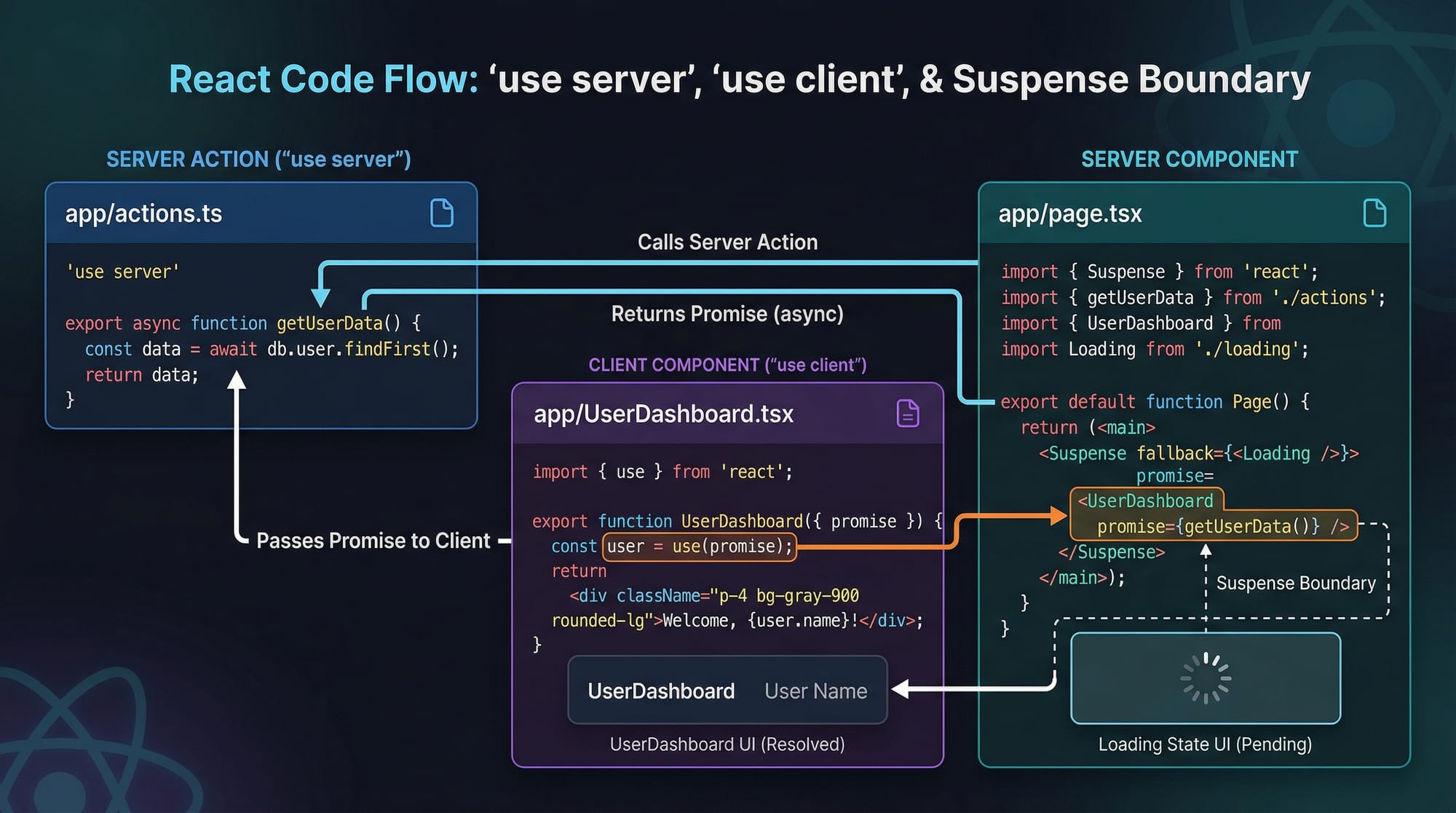 'use server'and'use client'directives define the execution context.- Suspense boundaries allow progressive rendering for better UX.