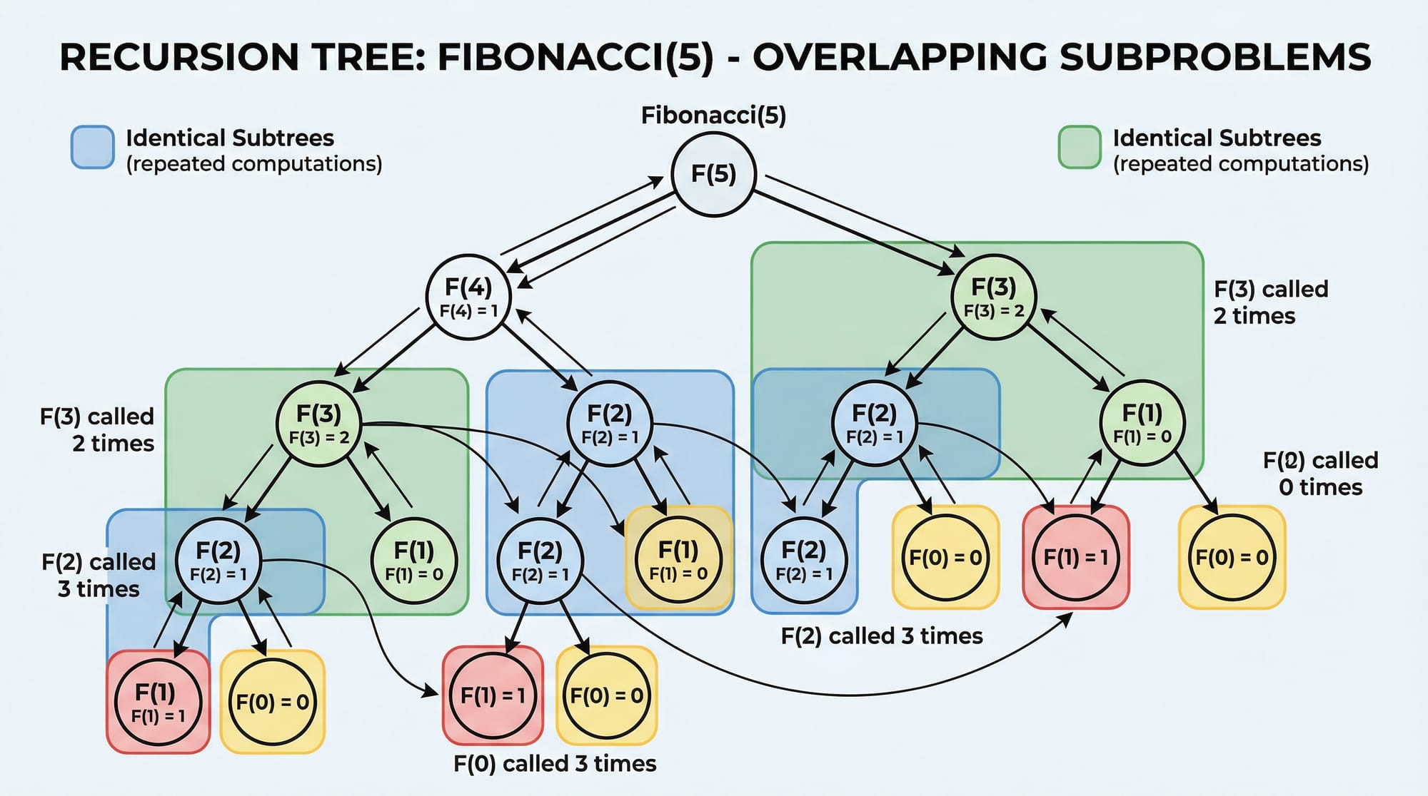 return fib(n-1) + fib(n-2) # Recomputes fib(n-2) multiple times