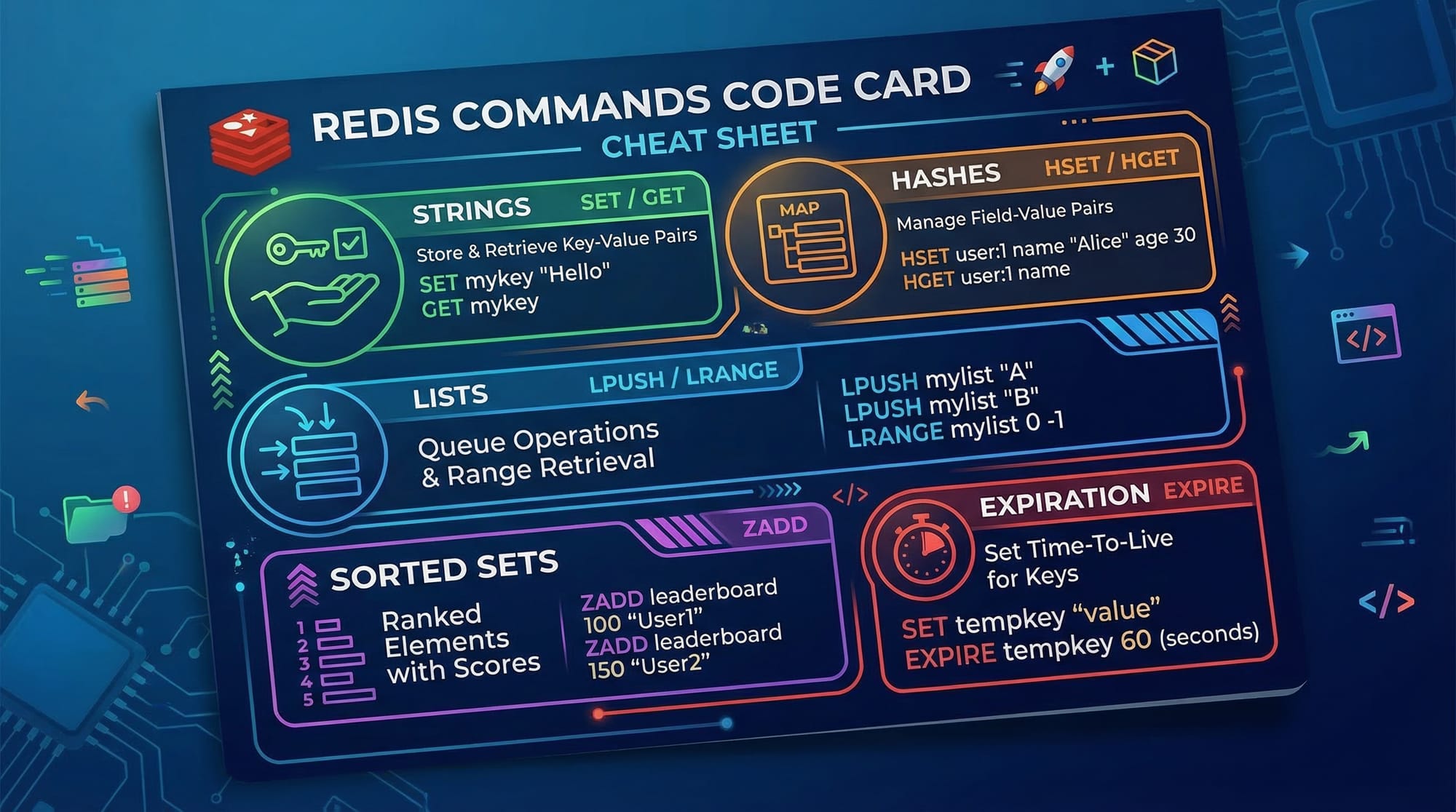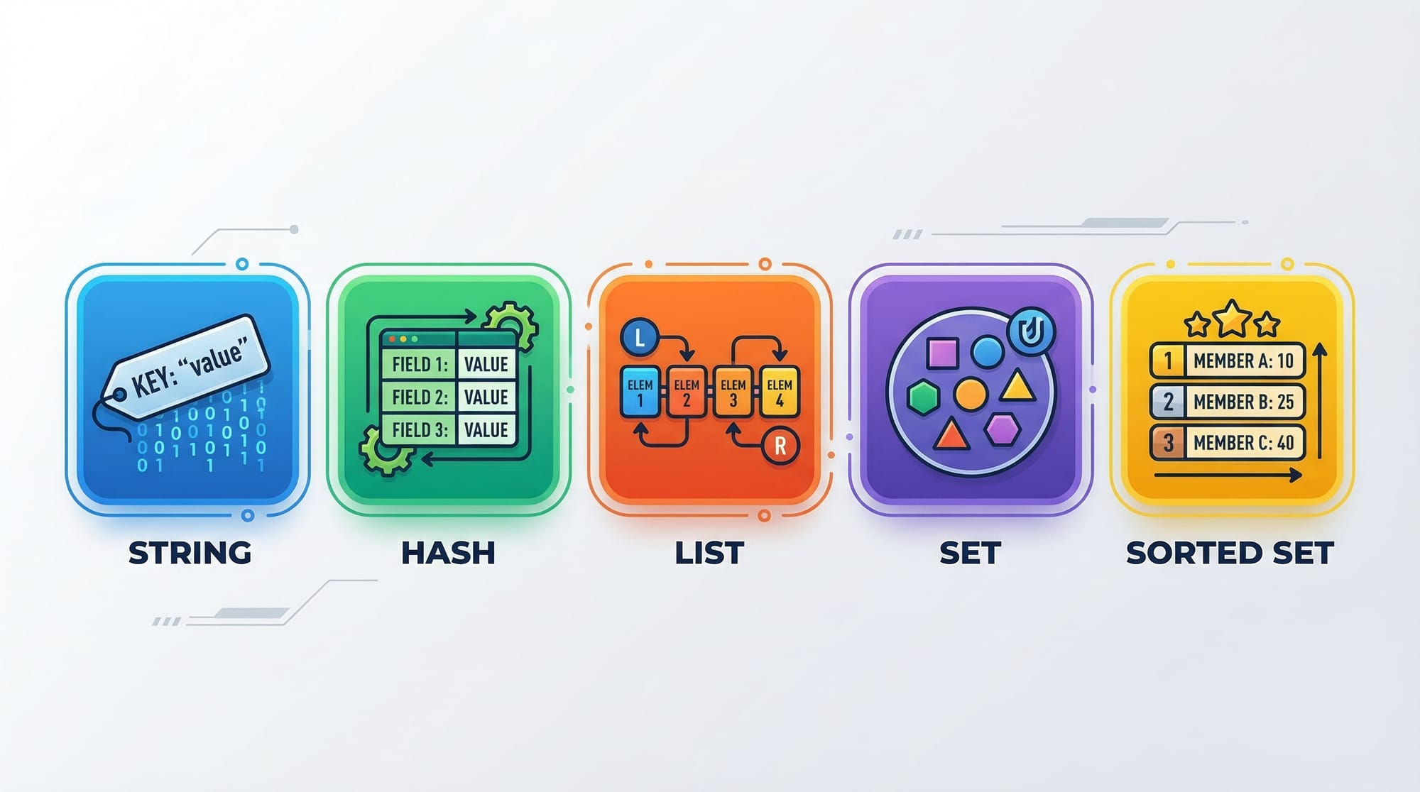 SETstores a simple string.HSETcreates a hash for structured data.LPUSHadds an element to the start of a list.ZADDadds a member with a score to a sorted set.EXPIREsets a time-to-live of 1 hour.
