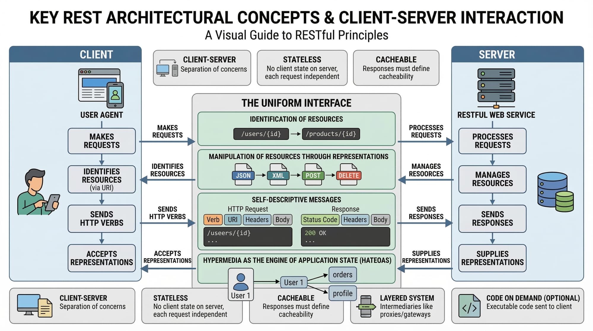 - Stateless: Each request contains all information needed; the server does not store client context.