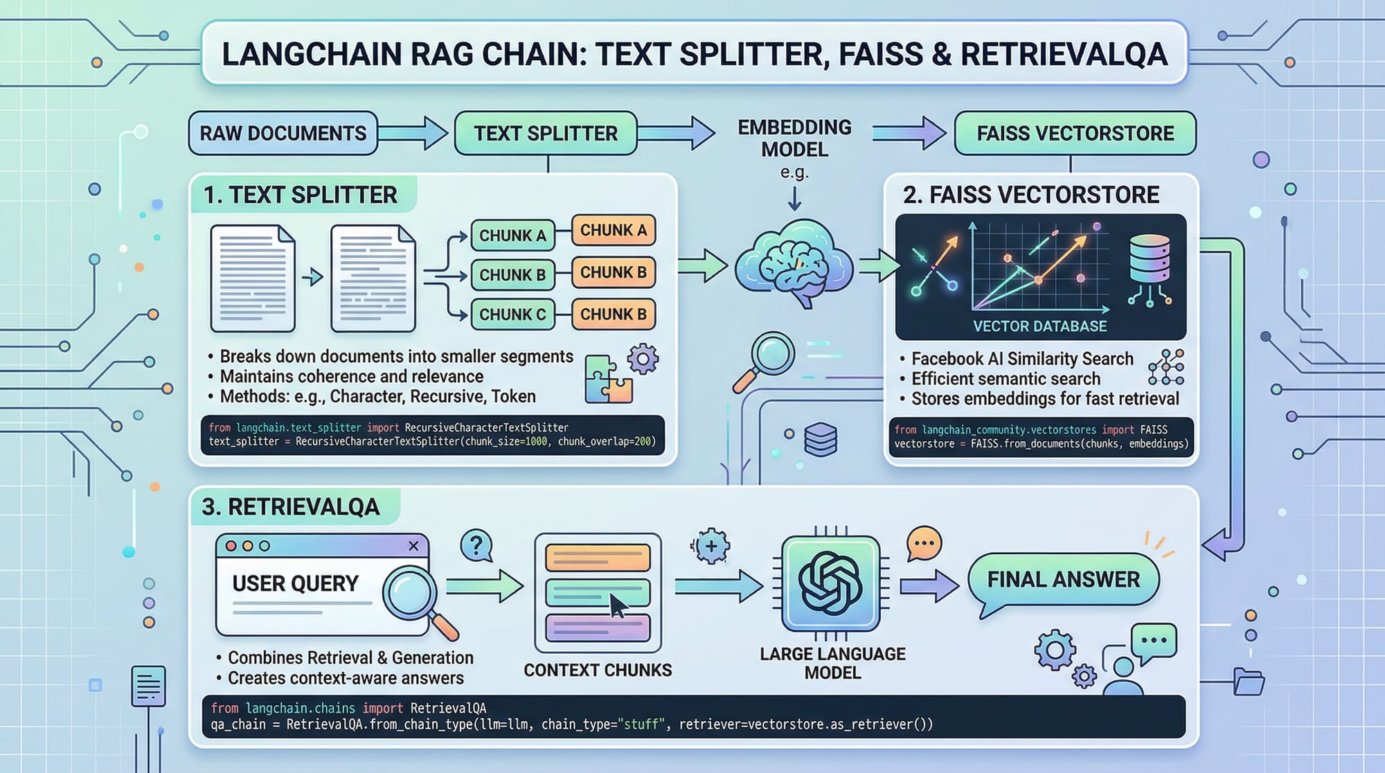 - Setup RetrievalQA chain linking LLM with retrieved context.