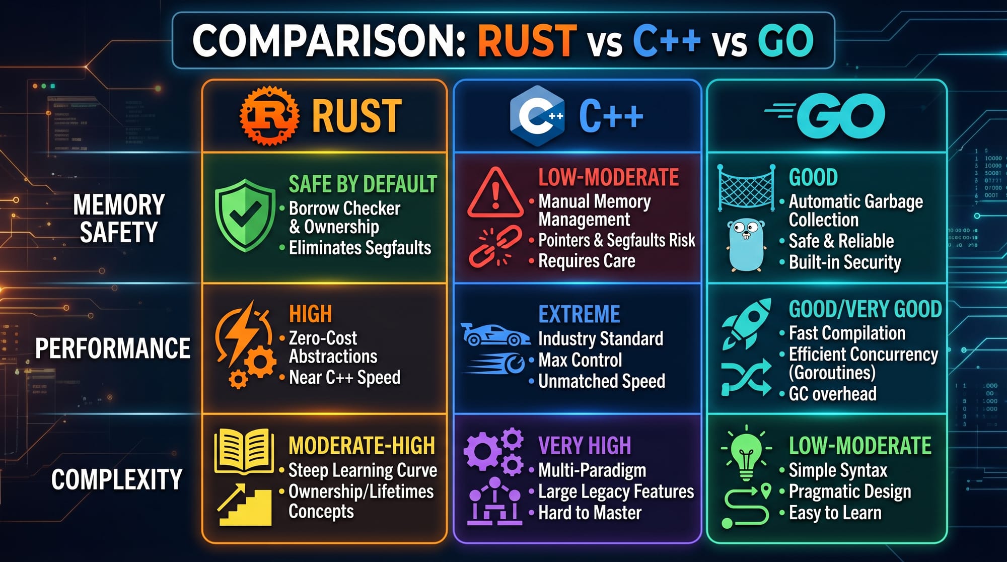 Rust provides memory safety without garbage collection, while C++ gives more manual control. Rust is safer, but both are powerful.