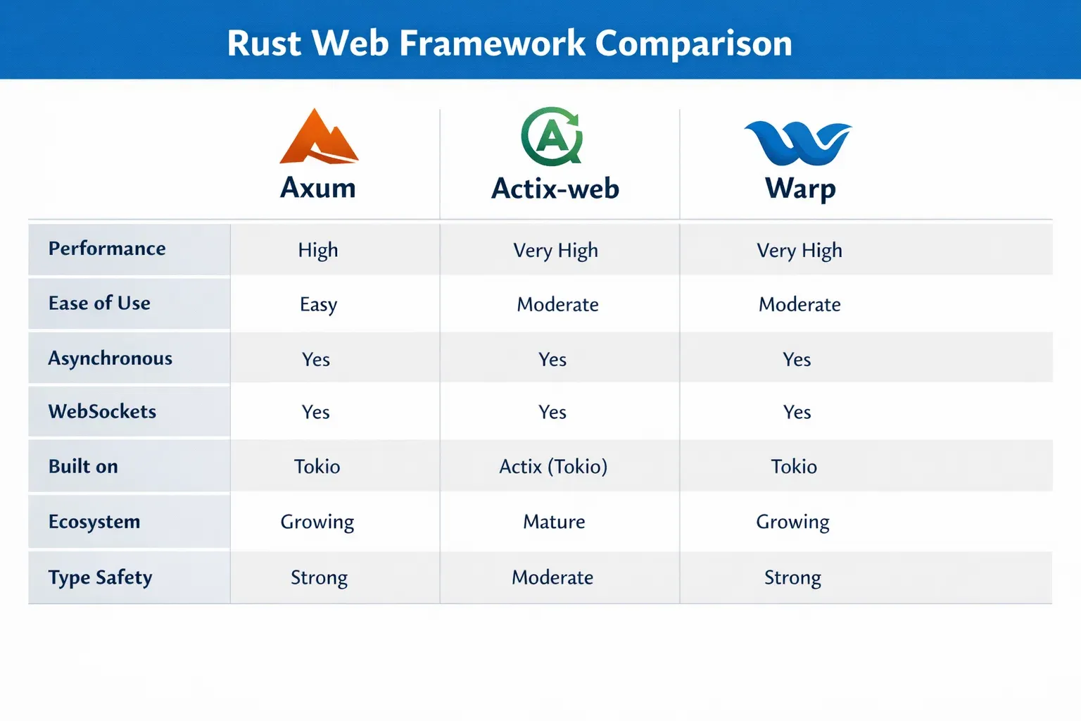- Rust enables high-performance, memory-safe backend systems.