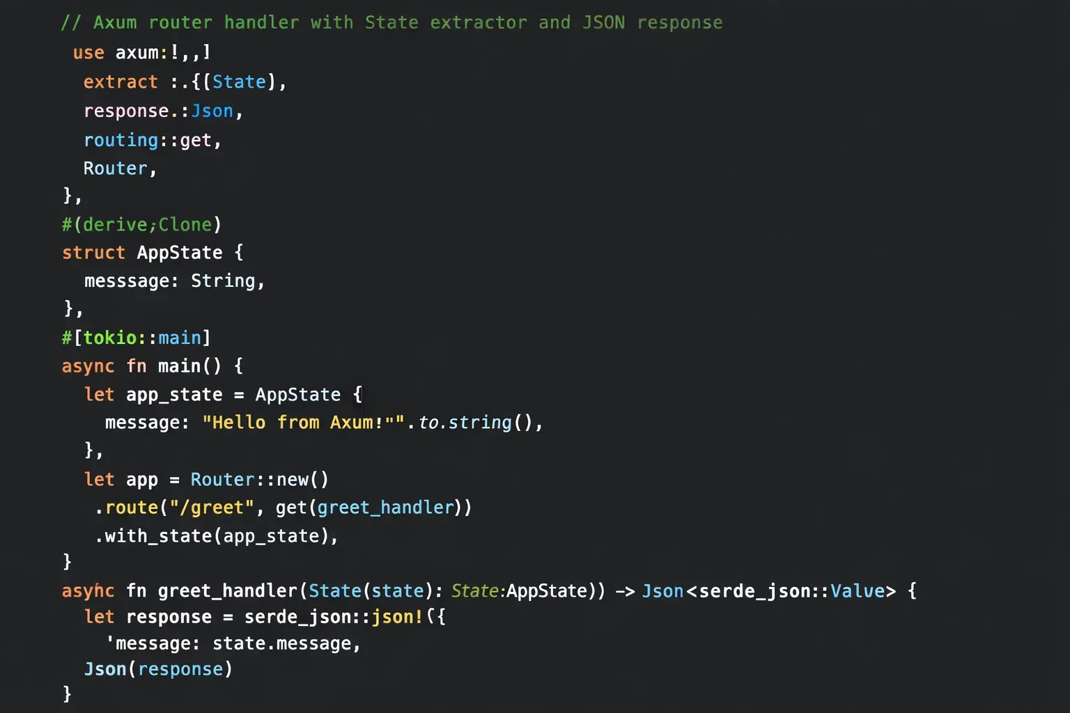 - Axum routers map URLs to async handler functions.