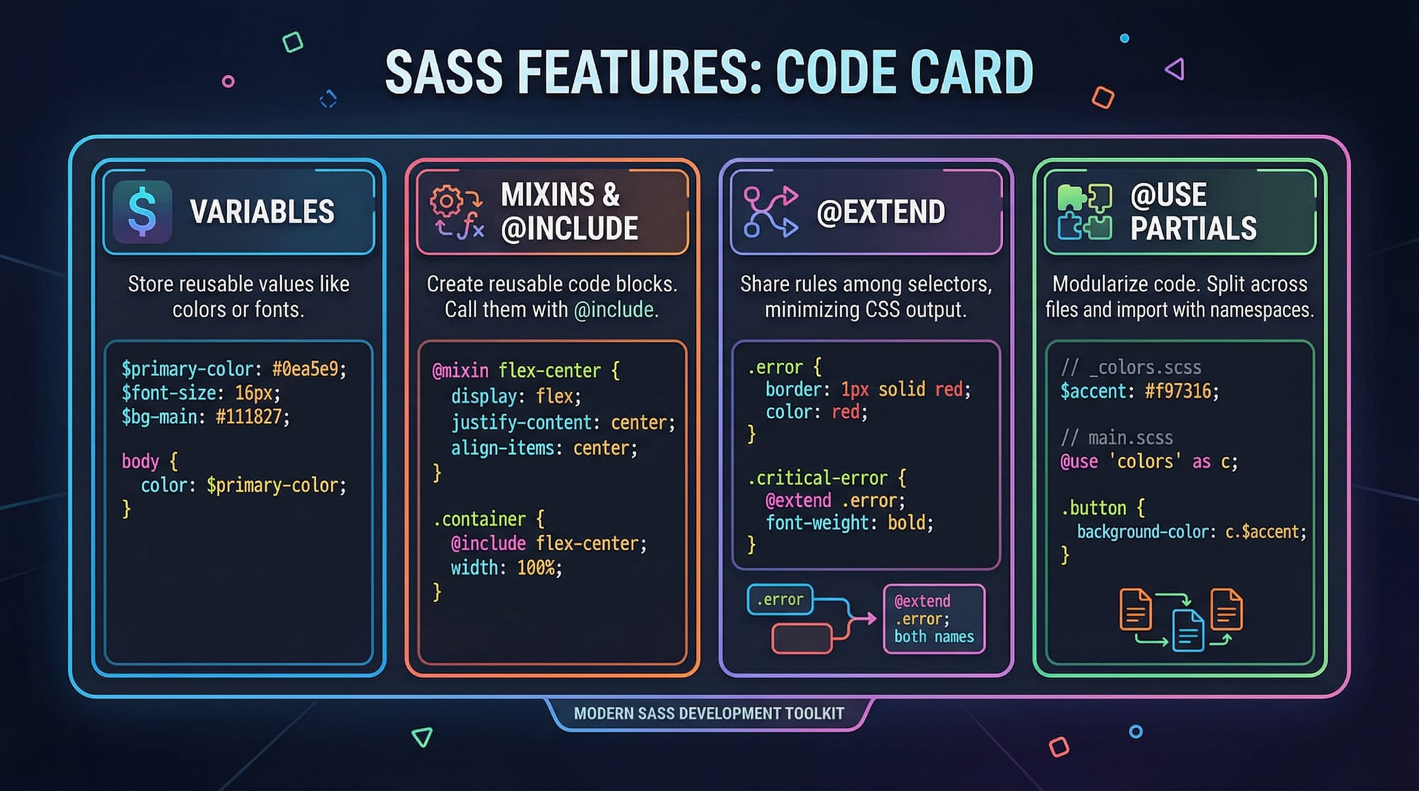 @mixin card-style($padding, $bg-color)defines a reusable block.@include card-style(20px, #f8f9fa)injects styles into.profile-card.