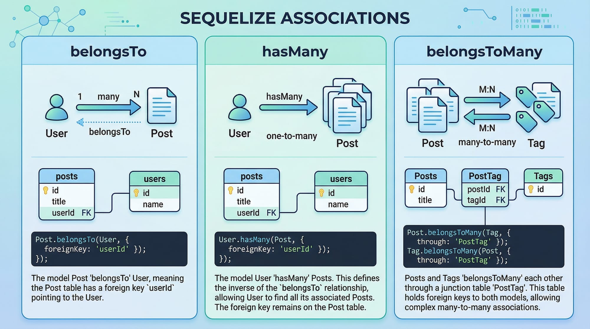 hasMany: One user can have many ordersbelongsTo: Order belongs to one userUserId: Foreign keyinclude: Fetch related data (JOIN)