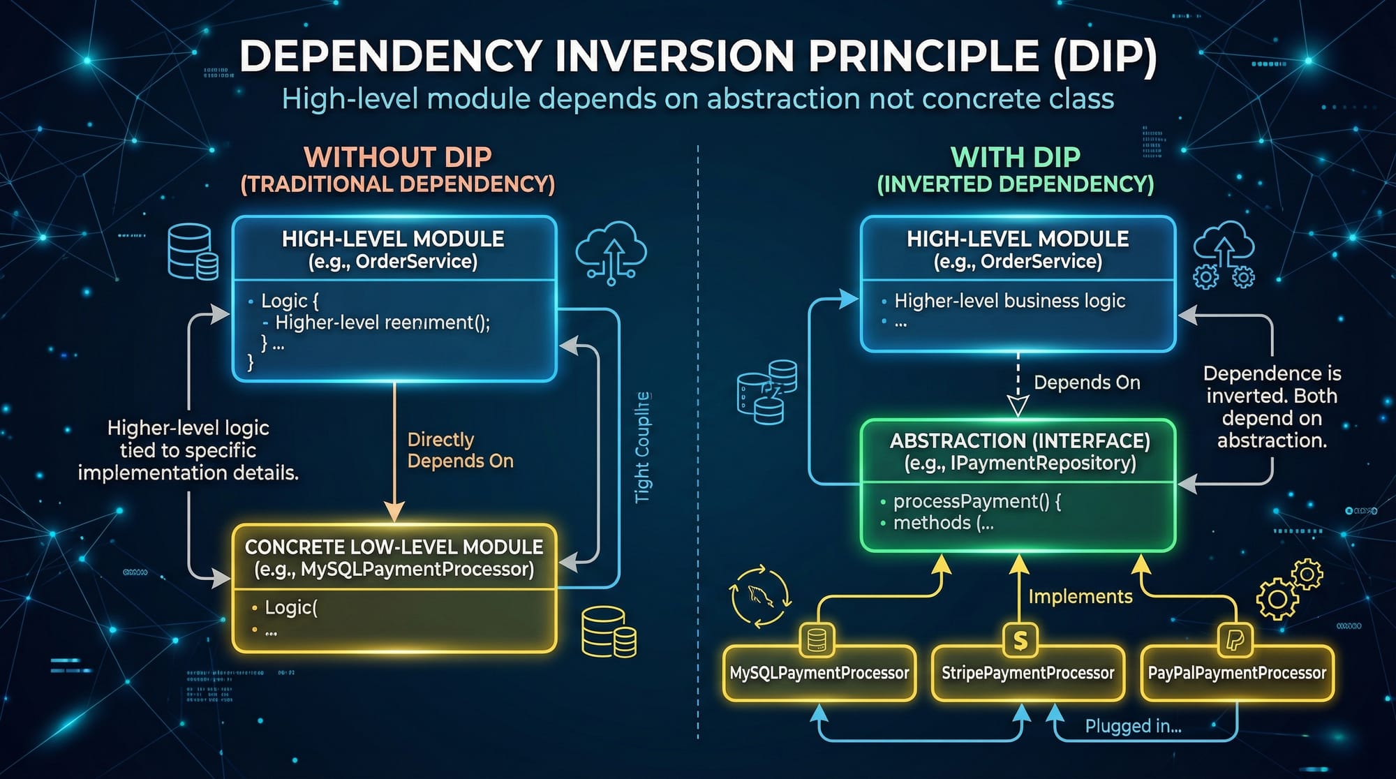 Definition: High-level modules should not depend on low-level modules. Both should depend on abstractions.