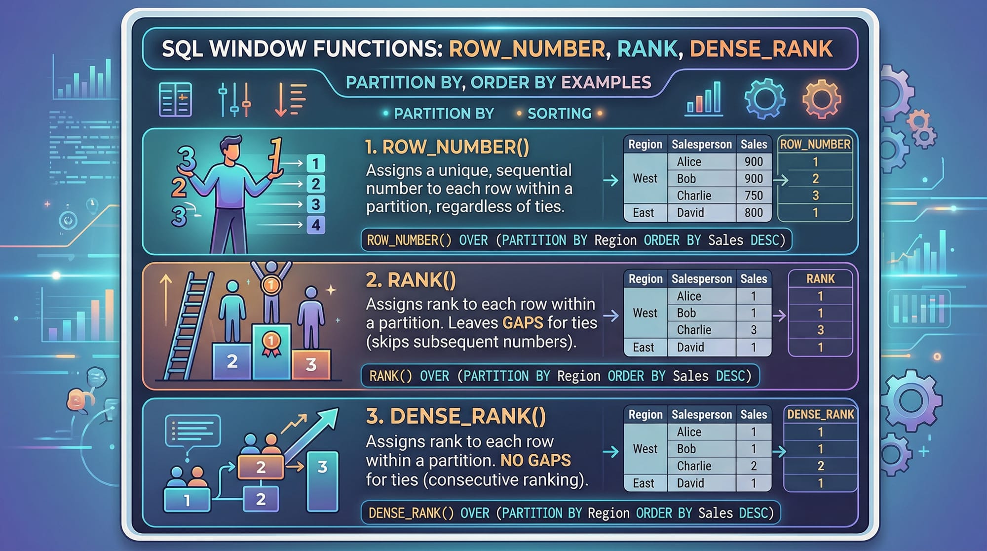 ROW_NUMBER()→ unique numberingRANK()→ skips numbers on tiesDENSE_RANK()→ no skipped numbers