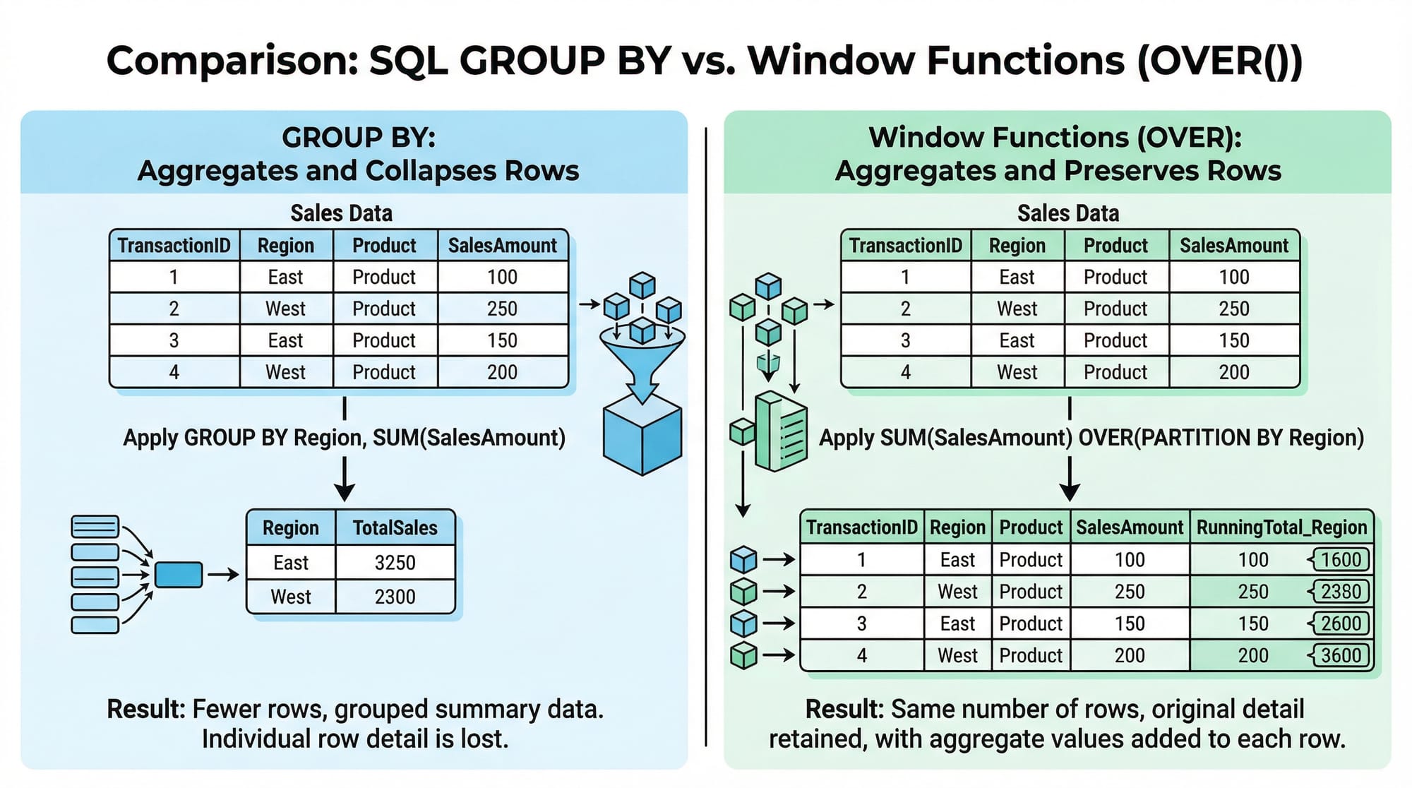 LAG()→ access previous rowLEAD()→ access next rowSUM() OVER()→ running totalsAVG() OVER()→ moving averages