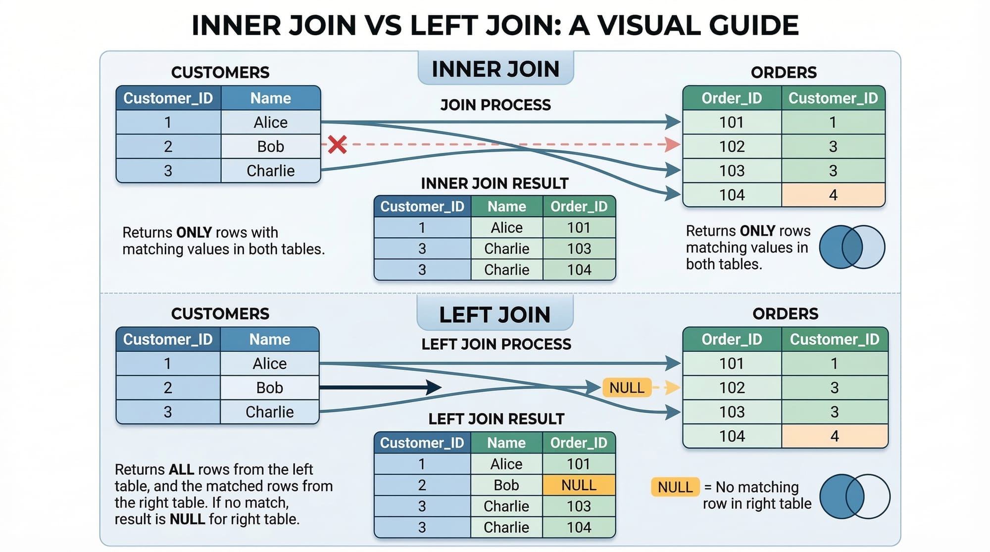 - LEFT JOIN shows all rows from the left table, with NULLs for unmatched.