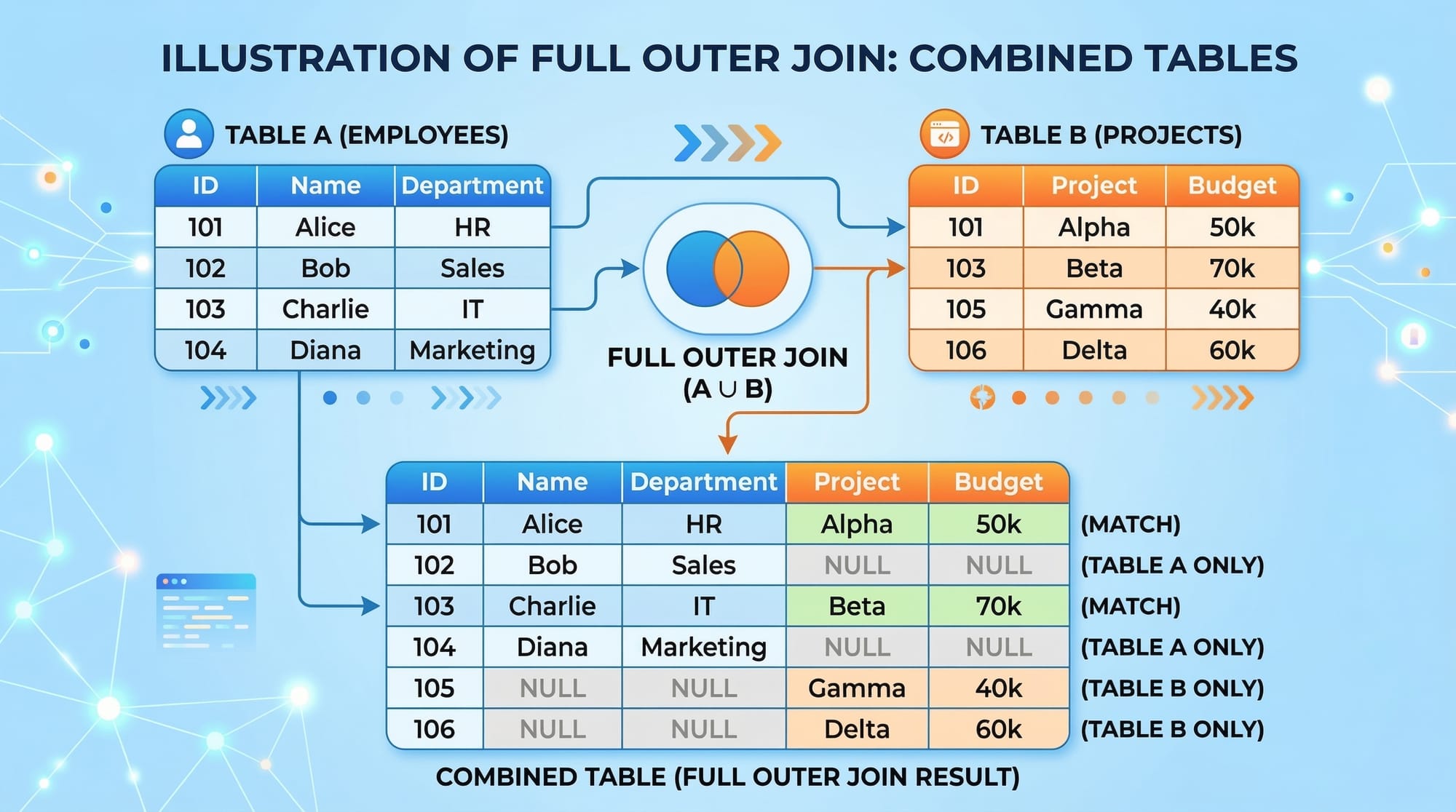 FULL OUTER JOIN returns all records when there is a match in either left or right table. Missing matches are filled with NULL.