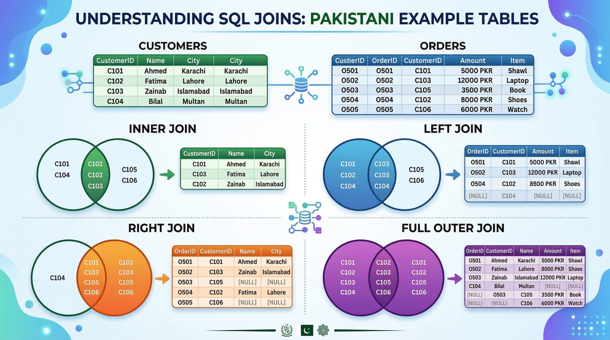 For Pakistani students, learning SQL joins is crucial because it forms the backbone of database-driven applications used in schools, businesses, e-commerce, banking, and government systems. For instance, if you want to see all orders placed by a customer in Lahore along with their payment details, SQL joins make this possible.