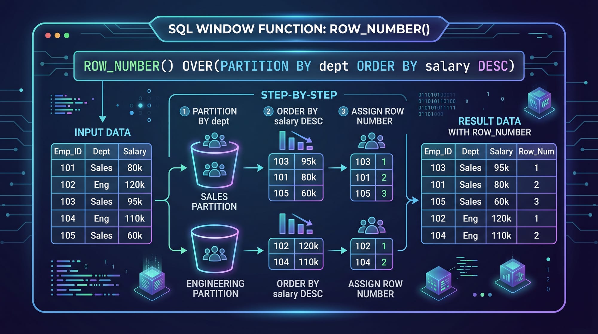 SELECT employee_name→ shows employee namedepartment→ shows department namesalary→ shows salary amountROW_NUMBER()→ assigns unique ranking per departmentPARTITION BY department→ resets numbering for each departmentORDER BY salary DESC→ highest salary gets rank 1AS row_num→ alias for output column