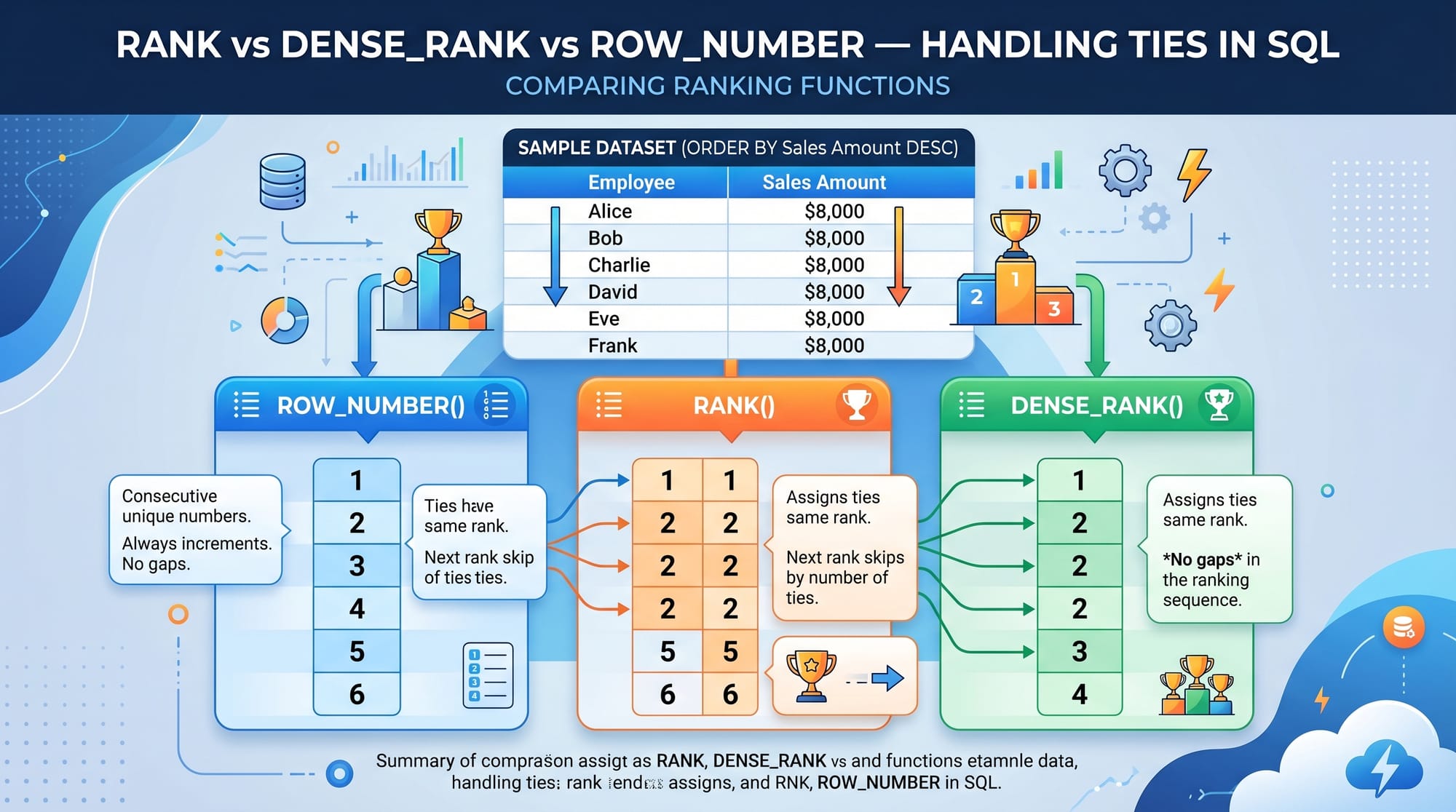 In simple terms, SQL window functions such as ROW_NUMBER, RANK, LEAD, and LAG help us analyze data row-by-row while still keeping the full dataset visible.