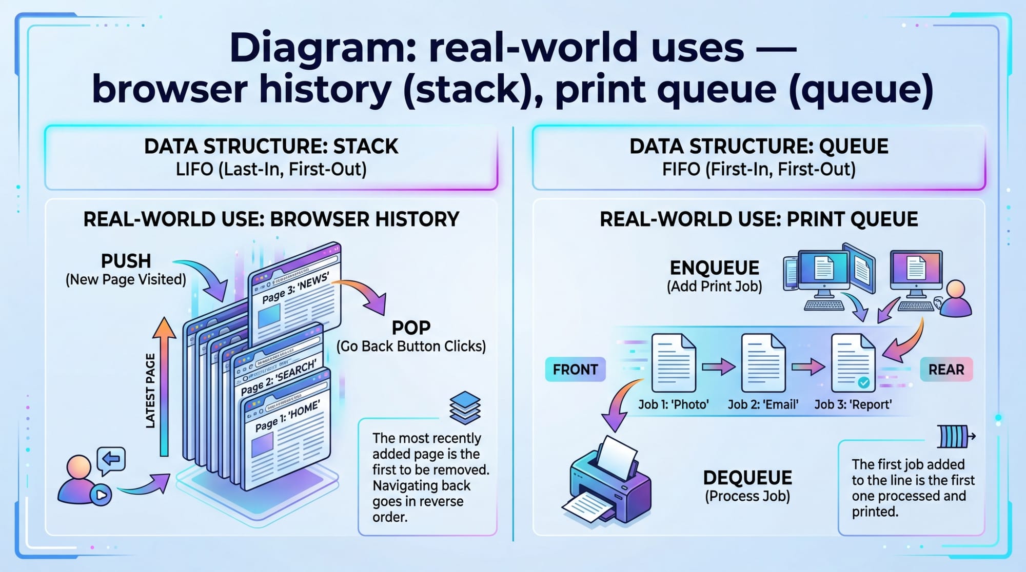 Stacks and queues are two of the most fundamental concepts in Data Structures & Algorithms (DSA). They help us organize and manage data efficiently, which is essential for building real-world applications such as web browsers, banking systems, and operating systems.