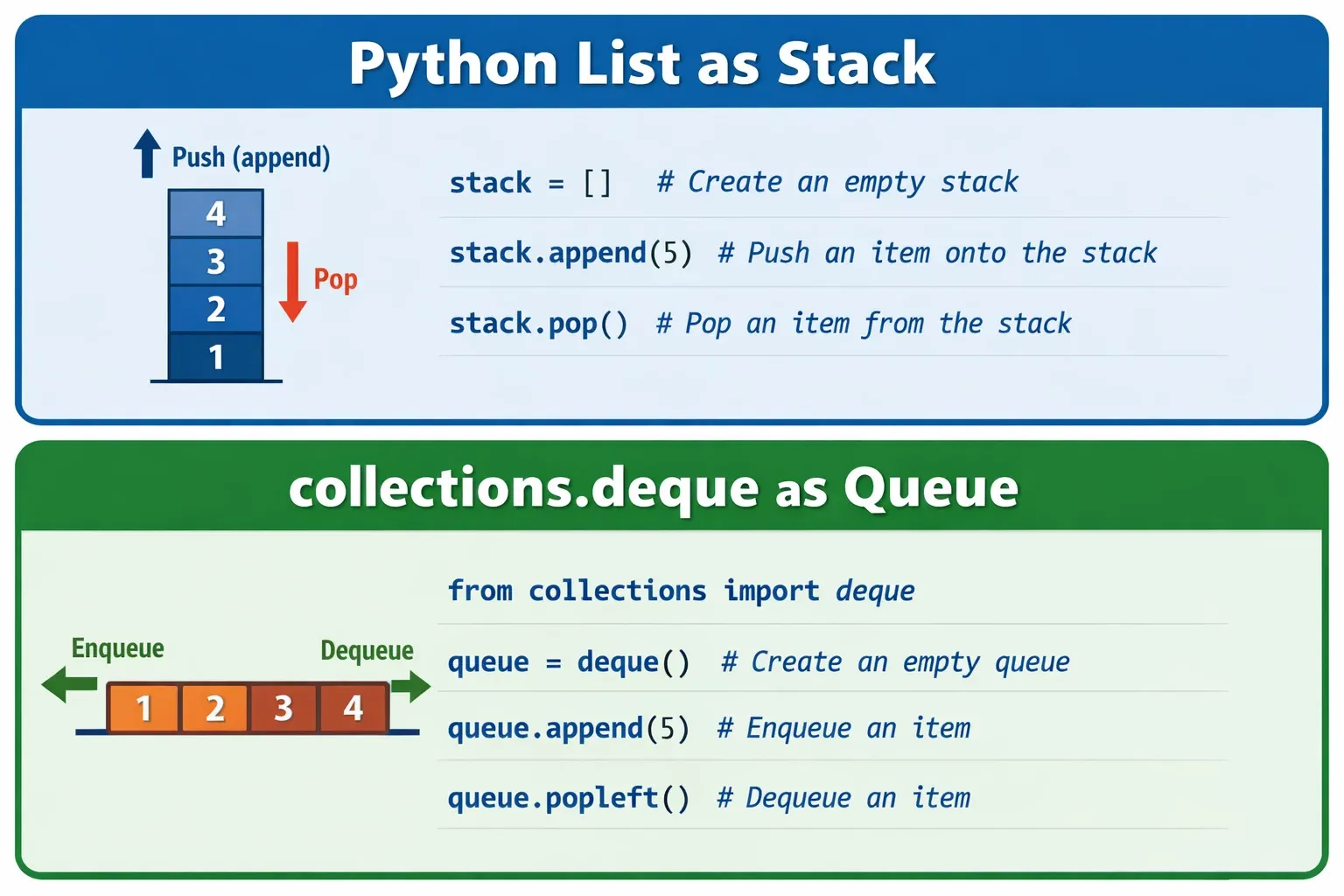 from collections import deque→ Imports efficient queue structuredeque()→ Creates a queueappend()→ Adds element at rear (enqueue)popleft()→ Removes element from front (dequeue)queue[0]→ Shows front element