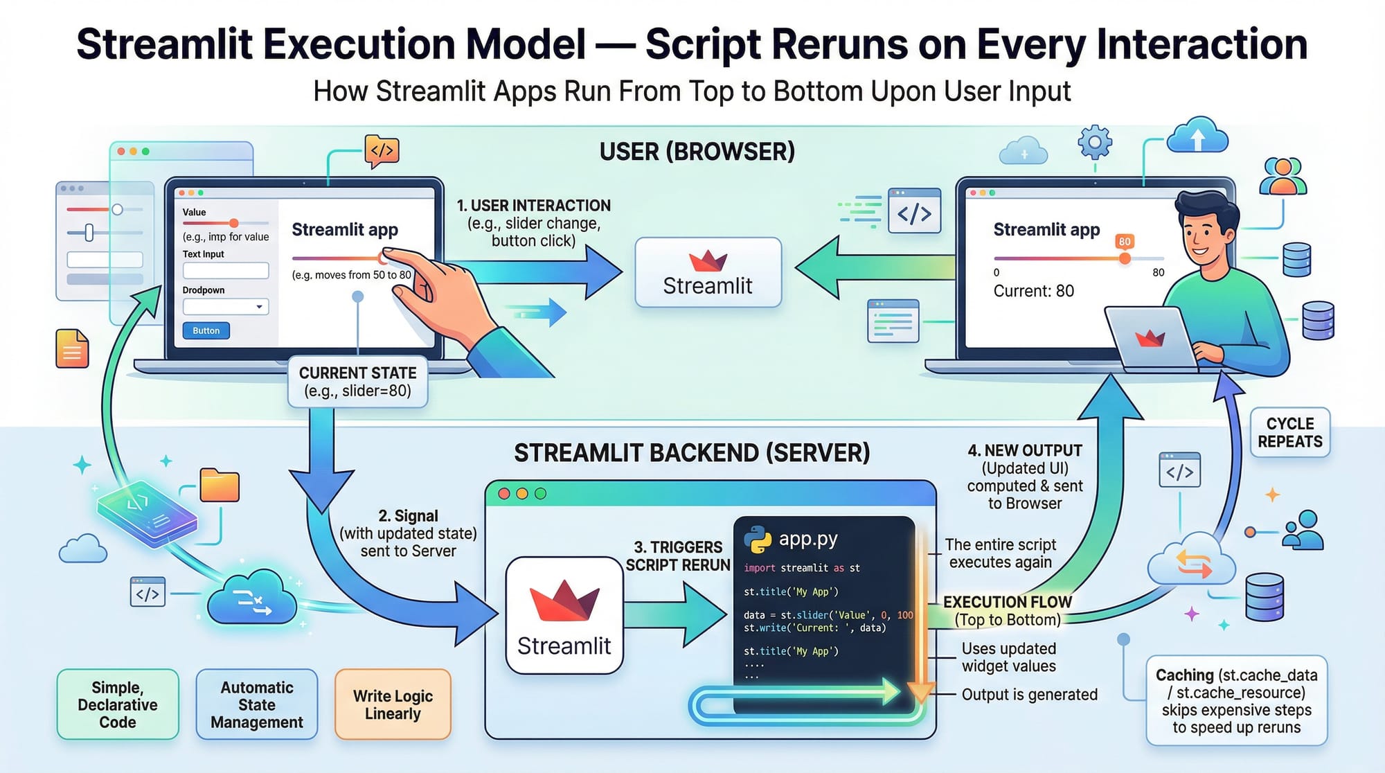 💡 Key idea: Every interaction (button click, slider move) reruns the script from top to bottom.