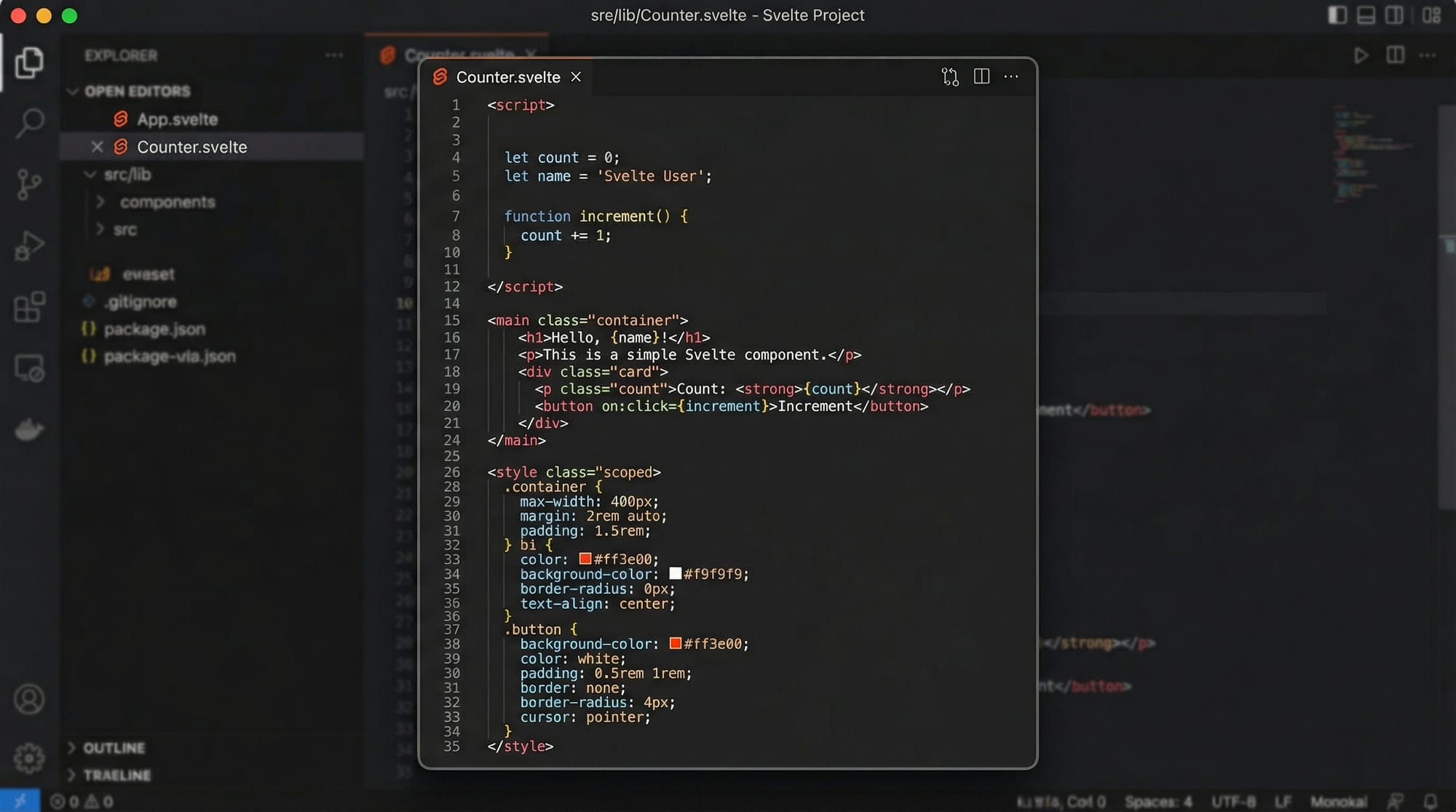 let count = 0;→ Initialize counterincrease()→ Increments valuedecrease()→ Decrements value{count}→ Displays value dynamicallyon:click={increase}→ Event binding