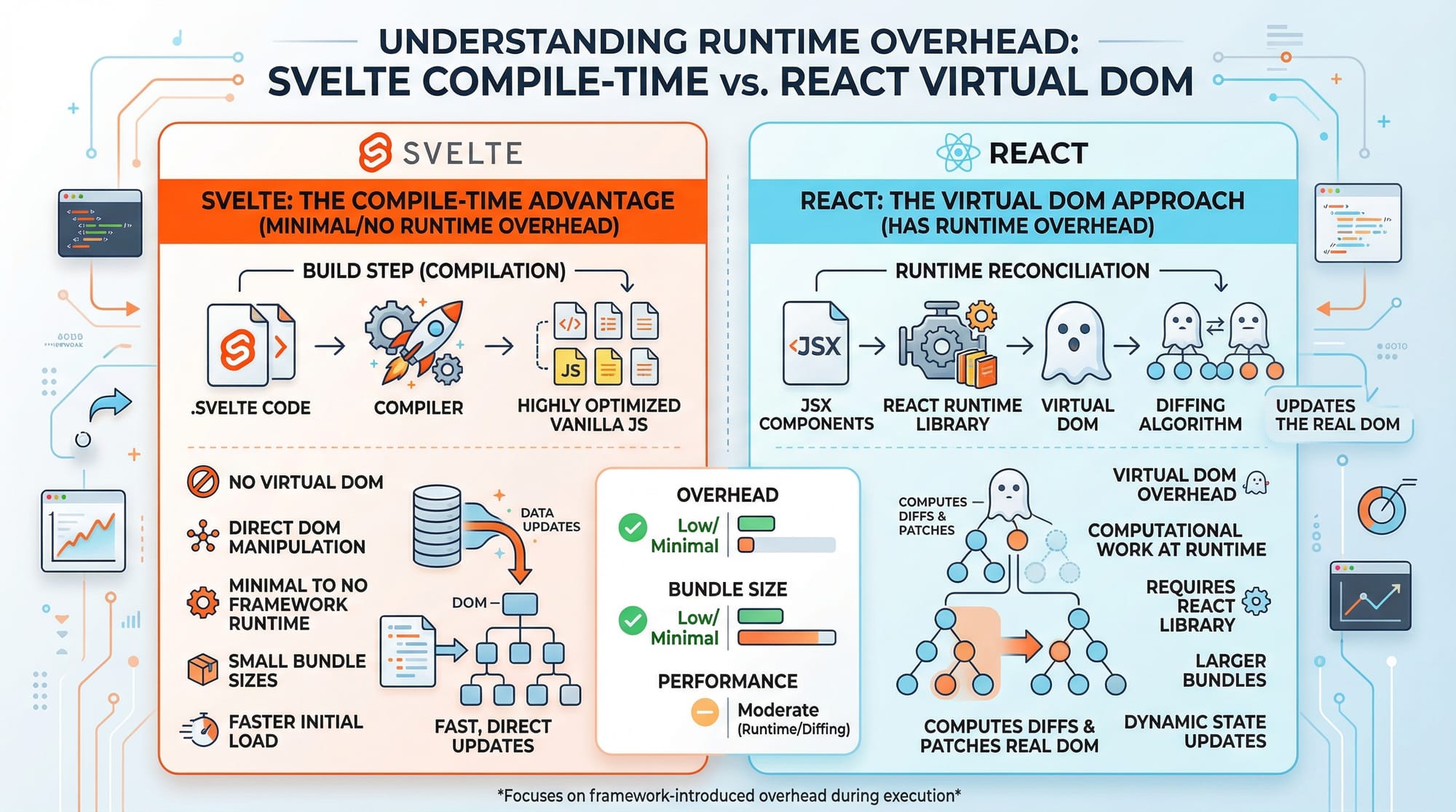 - Svelte is a compile-time framework with high performance