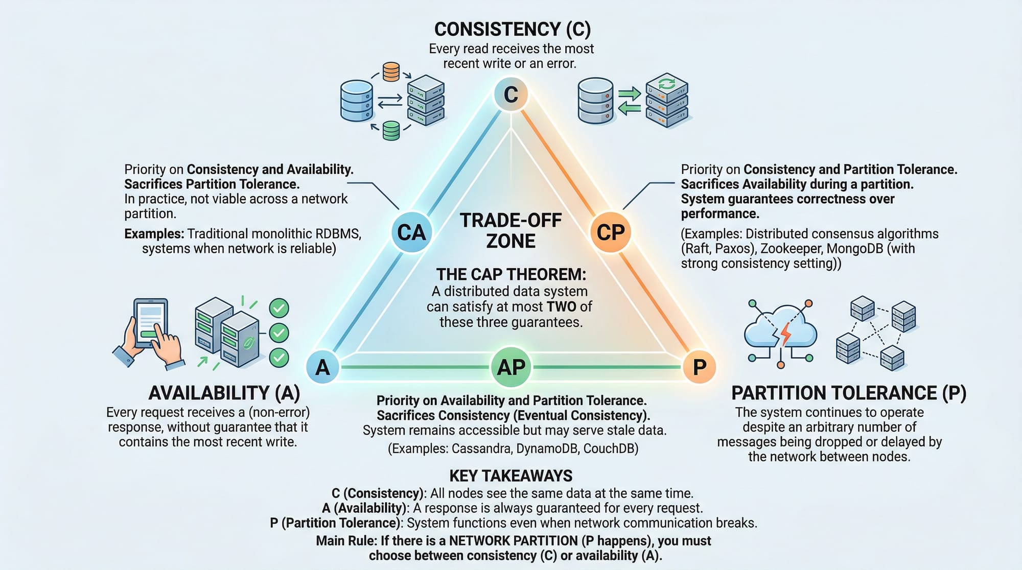 - Consistency: All nodes see the same data at the same time.