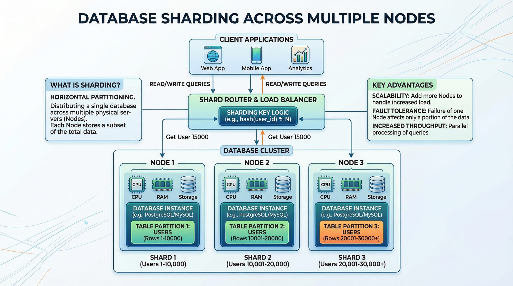 Example: Fatima’s e-commerce app in Karachi stores millions of user orders. Sharding by user ID ensures each database handles a portion of the load, preventing slow queries.