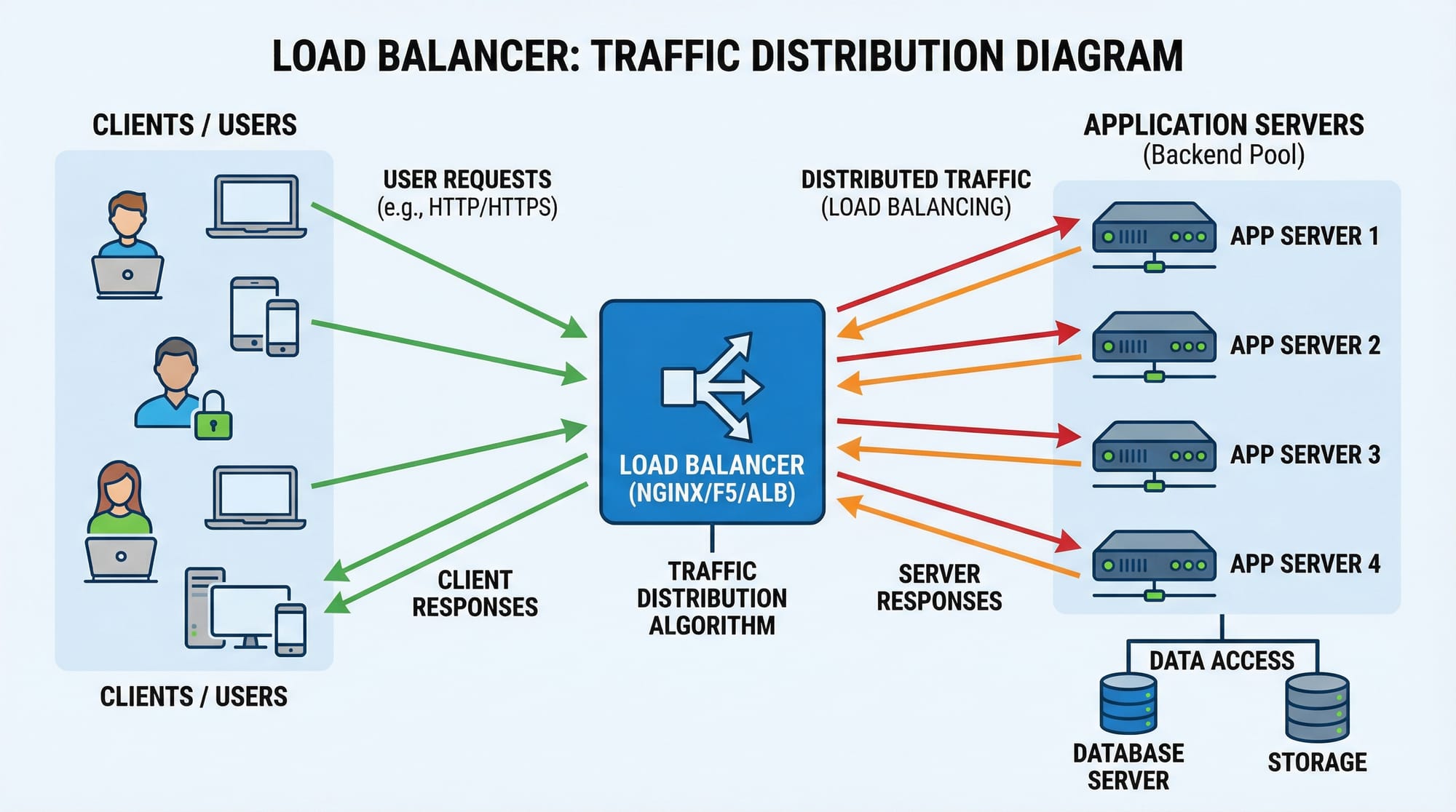 Example: Ahmad builds a food delivery app in Lahore. Initially, one server handles requests. During peak hours, requests surge to 5000 per second. By introducing a load balancer, traffic is distributed across multiple servers, ensuring consistent performance.
