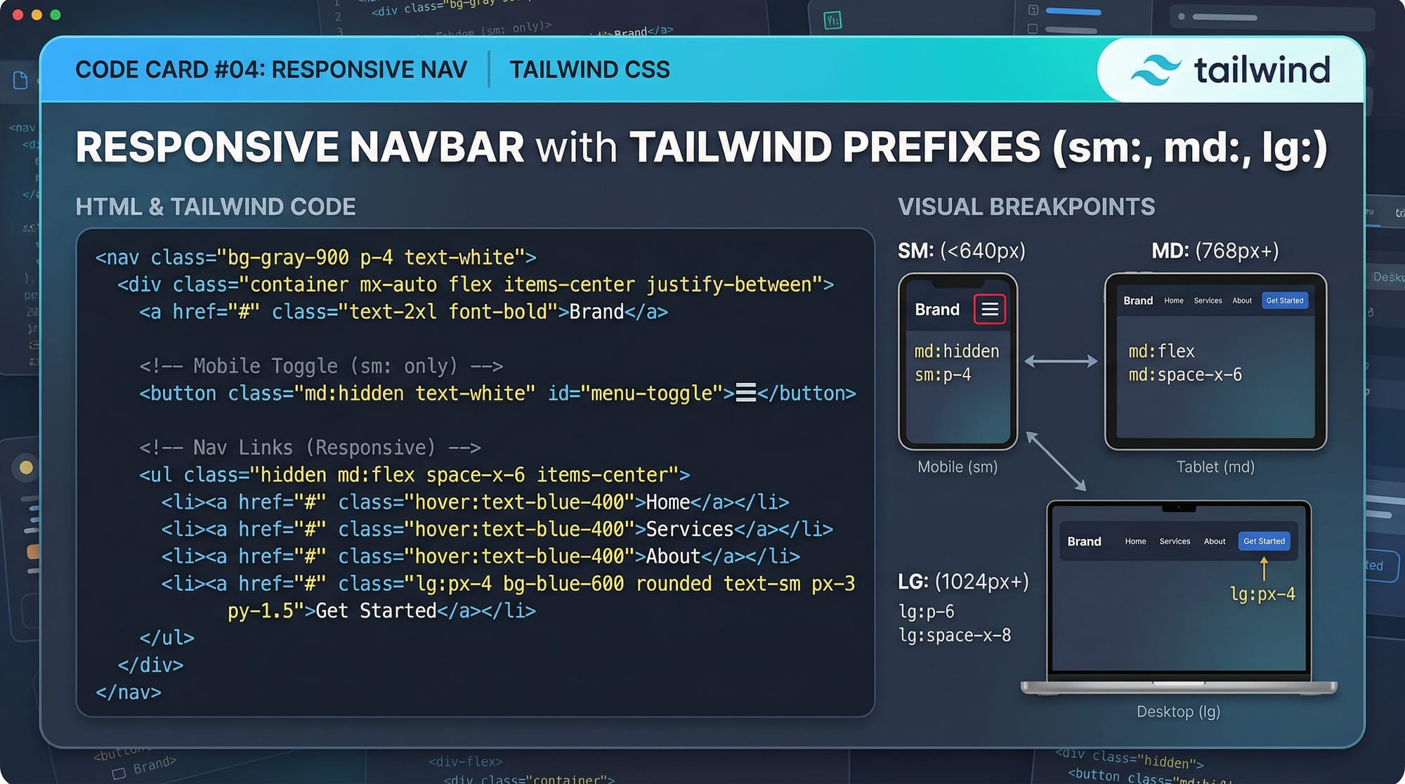 sm:→ small screens (≥ 640px)md:→ medium screens (≥ 768px)lg:→ large screens (≥ 1024px)xl:→ extra-large screens (≥ 1280px)