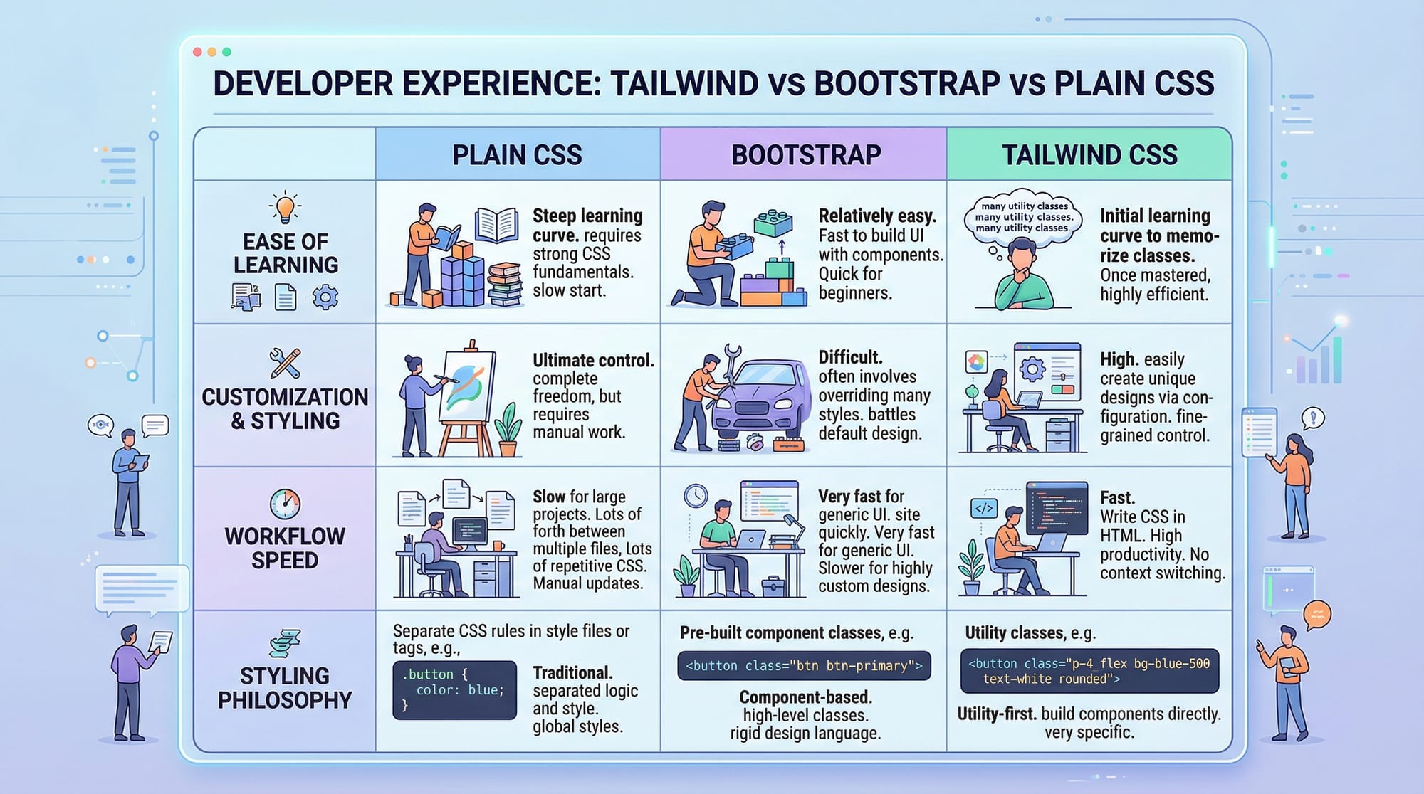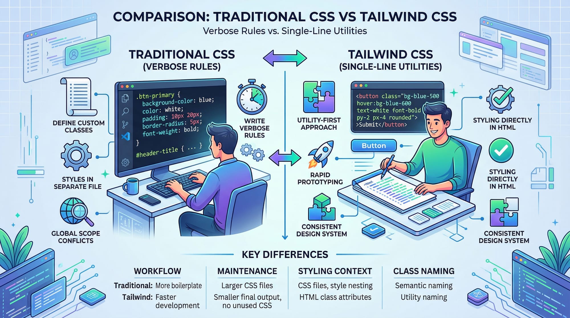 Tailwind promotes small, single-purpose classes that you apply directly in HTML. Instead of writing verbose CSS rules: