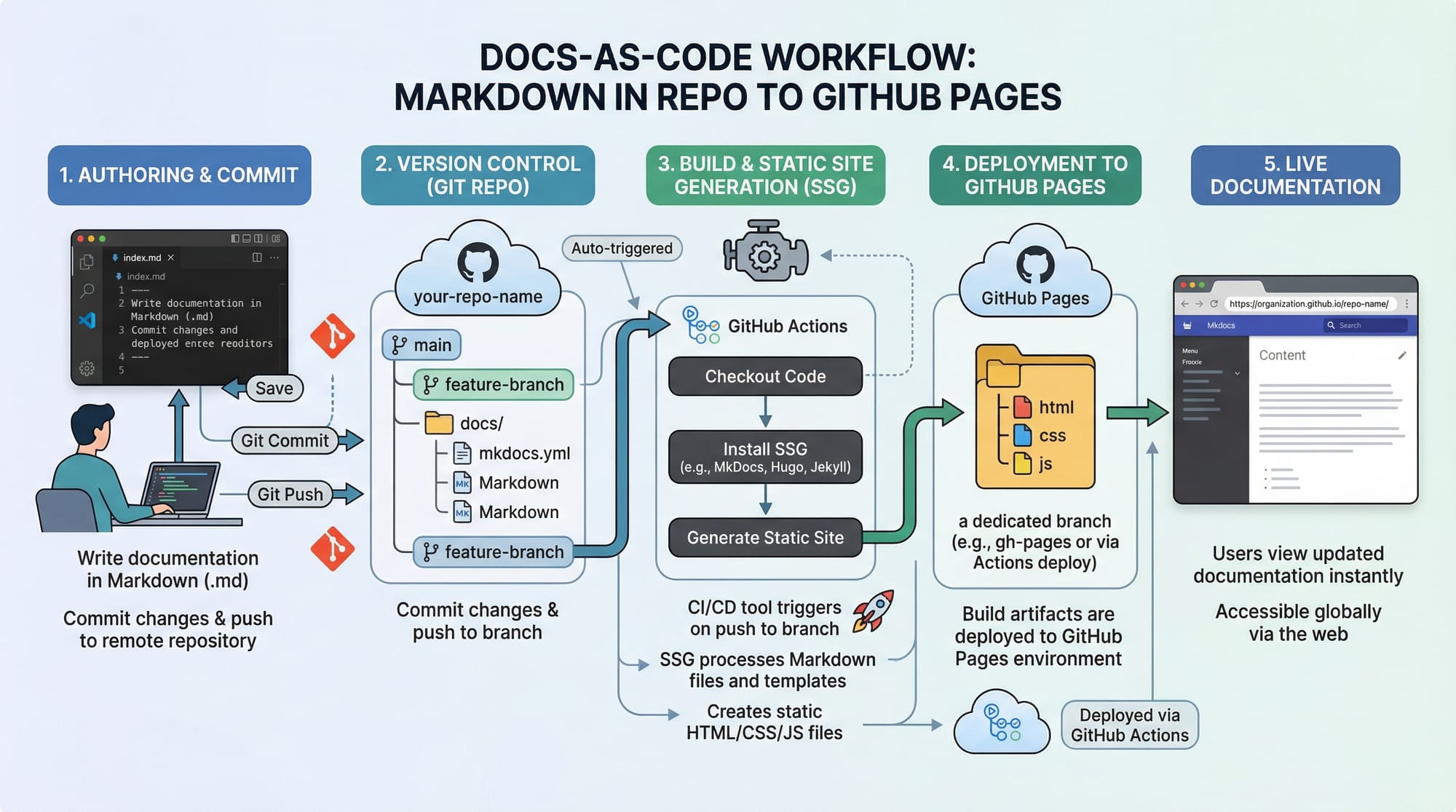 Use **docs-as-code workflow**: keep Markdown files in the repository, update as code changes, and deploy to GitHub Pages or a site generator.
