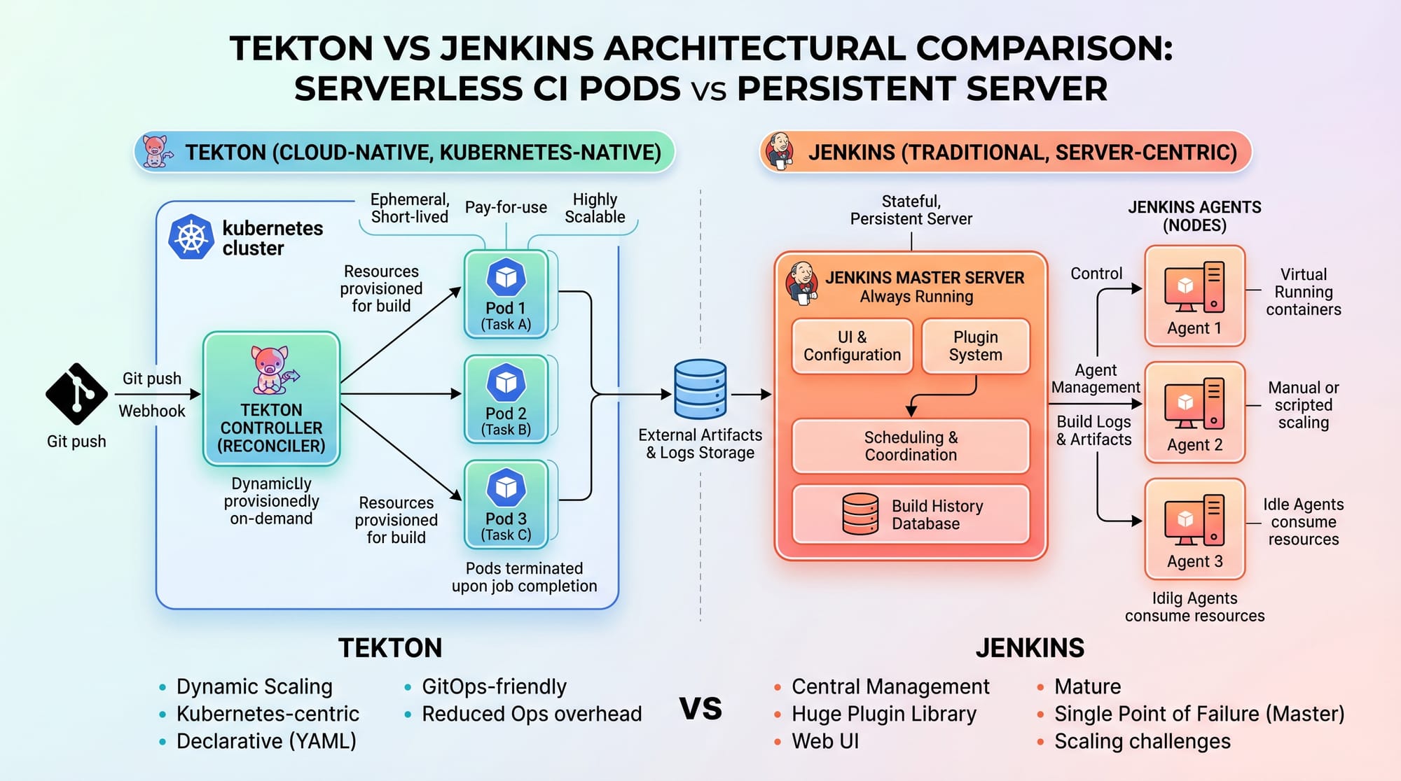 - Tekton is scalable and cloud-native compared to traditional CI/CD tools