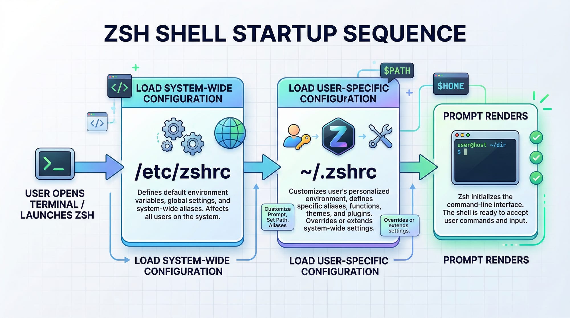 eval "$(starship init zsh)"initializes Starship.- Prompts will update automatically on new shell sessions.