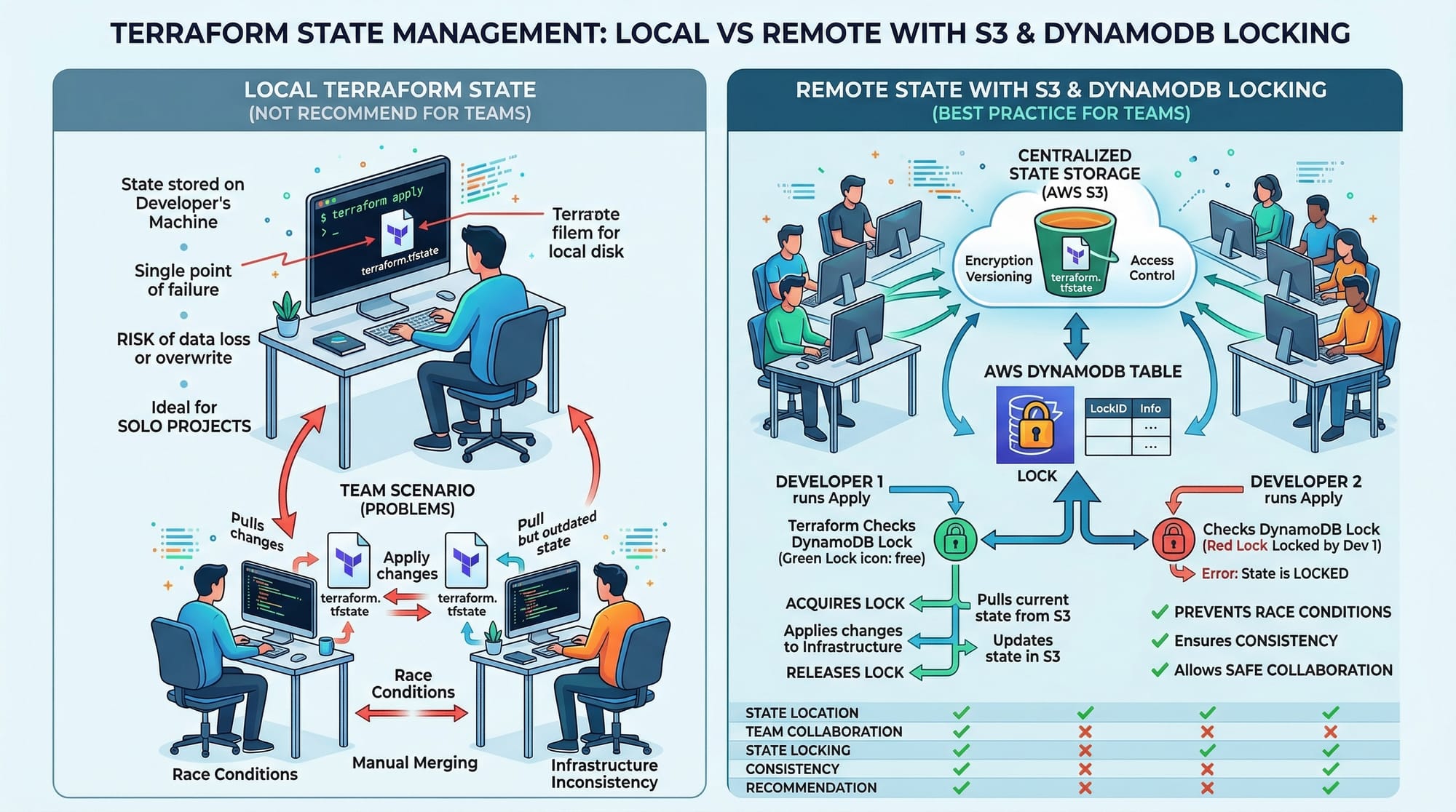 Solution: Use remote state with S3 + DynamoDB for locking.