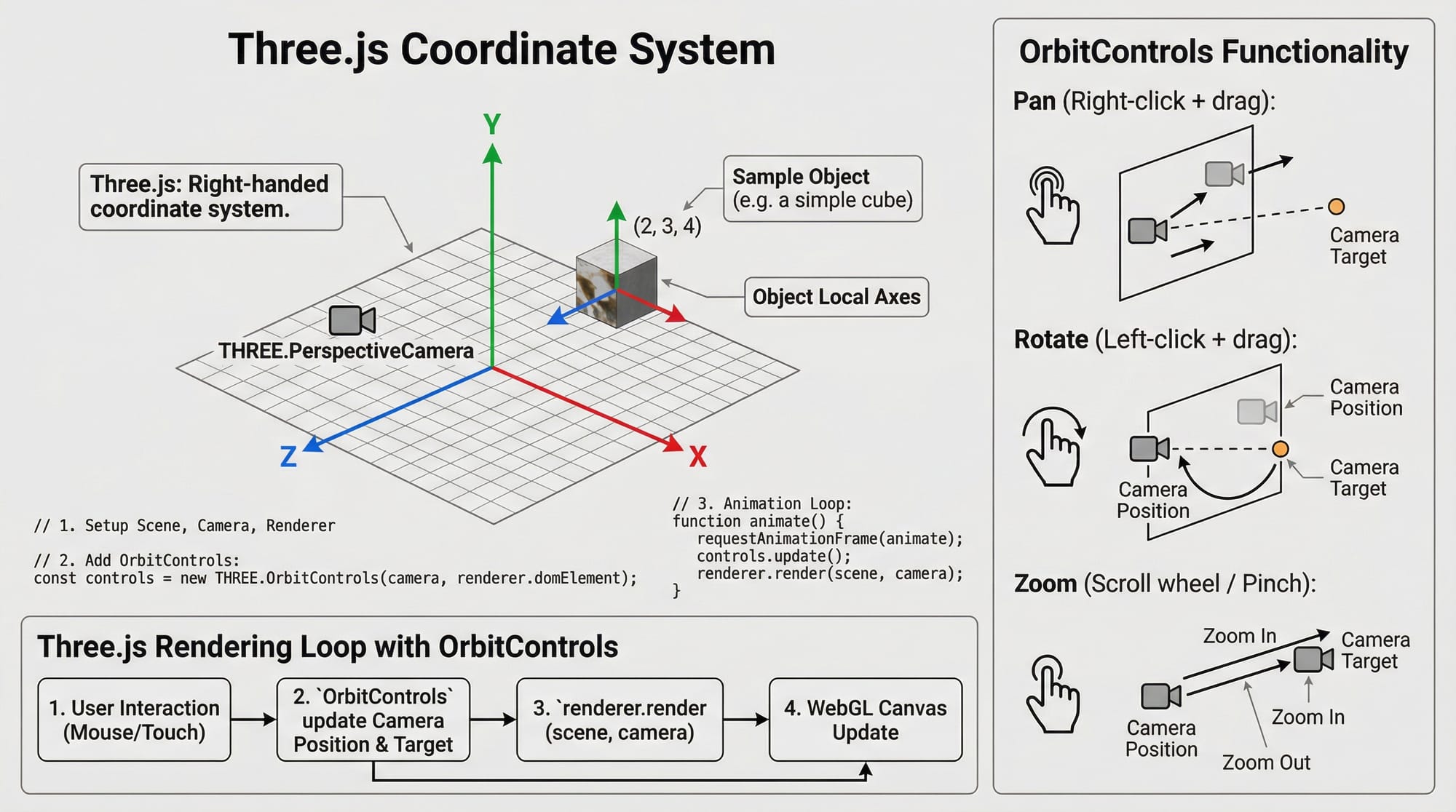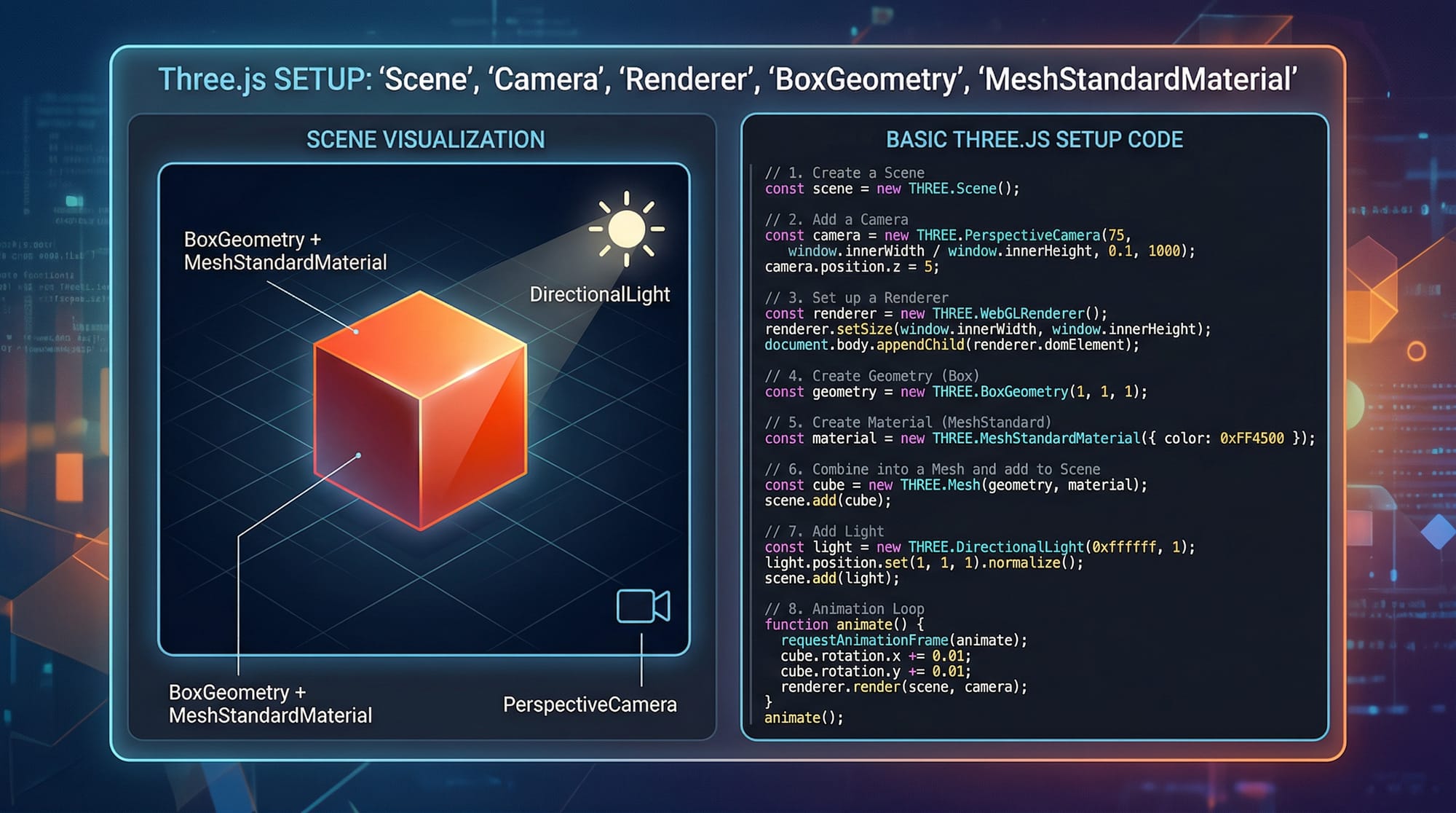 THREE.Scene()→ Creates 3D environmentPerspectiveCamera()→ Defines viewing angleWebGLRenderer()→ Renders graphicsBoxGeometry()→ Creates cube shapeMeshStandardMaterial()→ Adds color & lightingPointLight()→ Adds light sourcecamera.position.z = 5→ Moves camera backanimate()→ Continuously updates scenecube.rotation.x/y→ Rotates cube