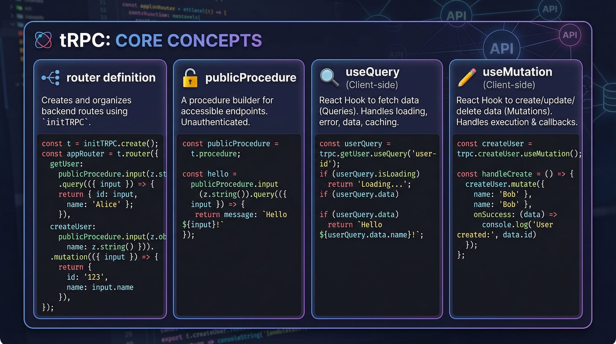 - Routers, queries, and mutations are core concepts.