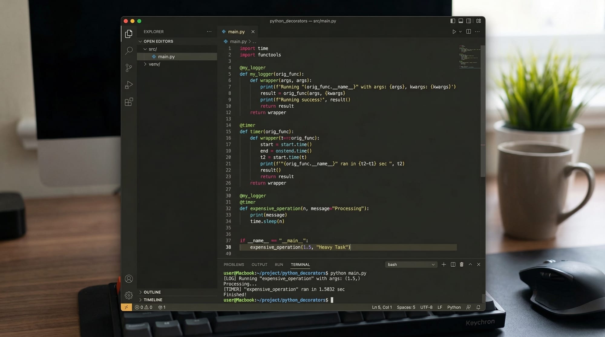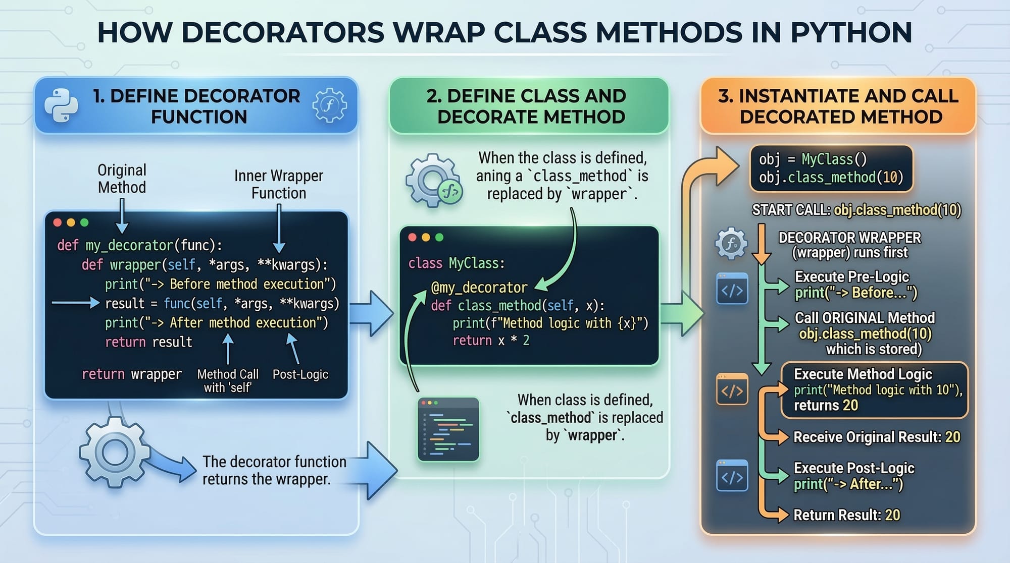 function Log(target: any, propertyKey: string, descriptor: PropertyDescriptor)– Defines a method decorator.const originalMethod = descriptor.value;– Stores the original method for later use.descriptor.value = function (...args: any[]) { ... }– Overrides the method to add logging.@Log– Applies the decorator tocreateUser.userService.createUser("Ali", 5000);– Demonstrates decorator in action.