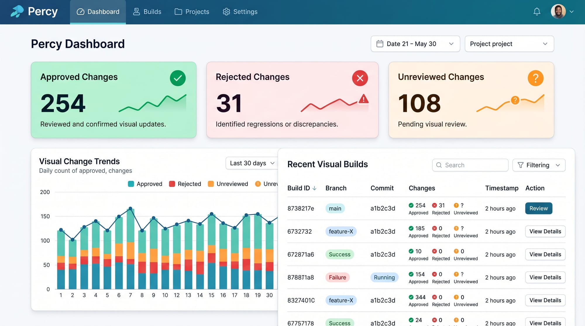 Percy captures screenshots during automated tests and compares them with baseline images. Any differences are flagged for review in a visual dashboard.