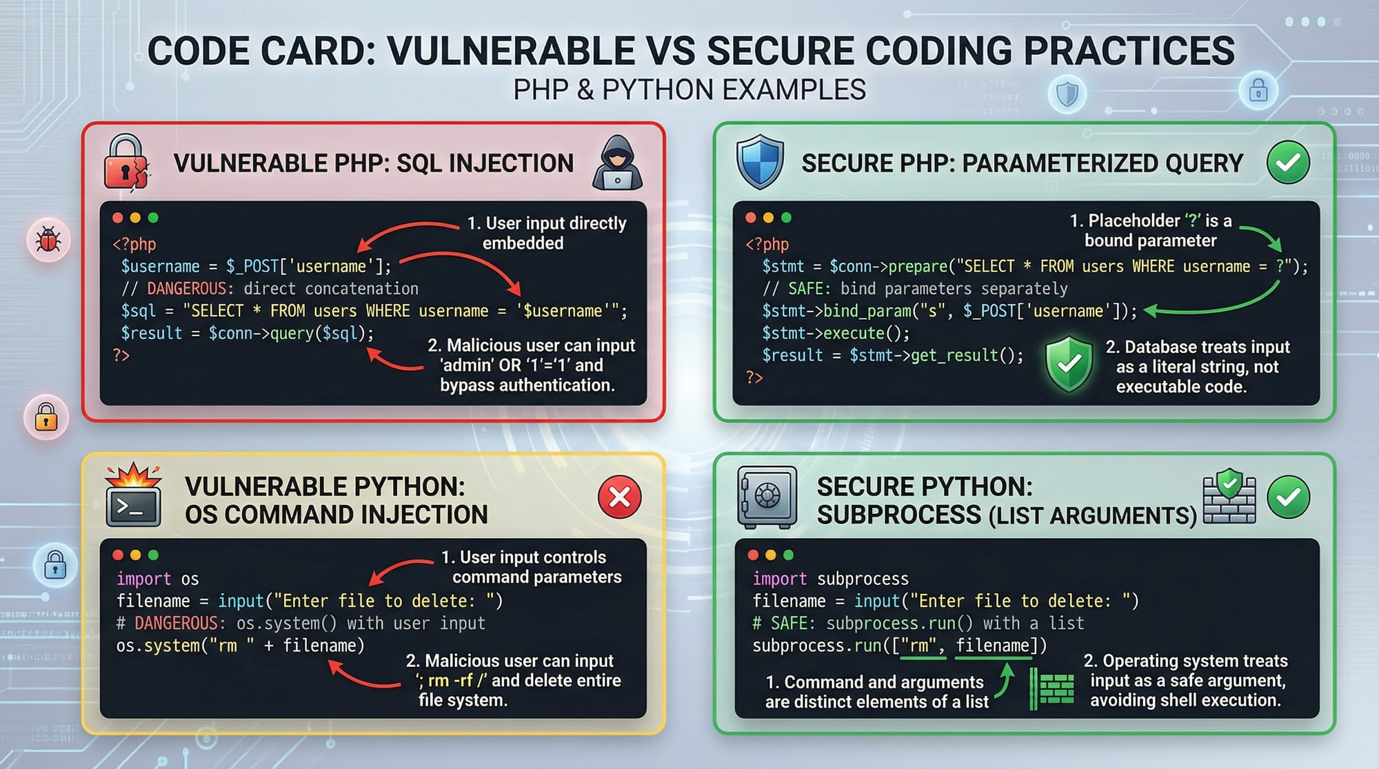 - Lines 8-11: Secure prepared statement prevents injection.