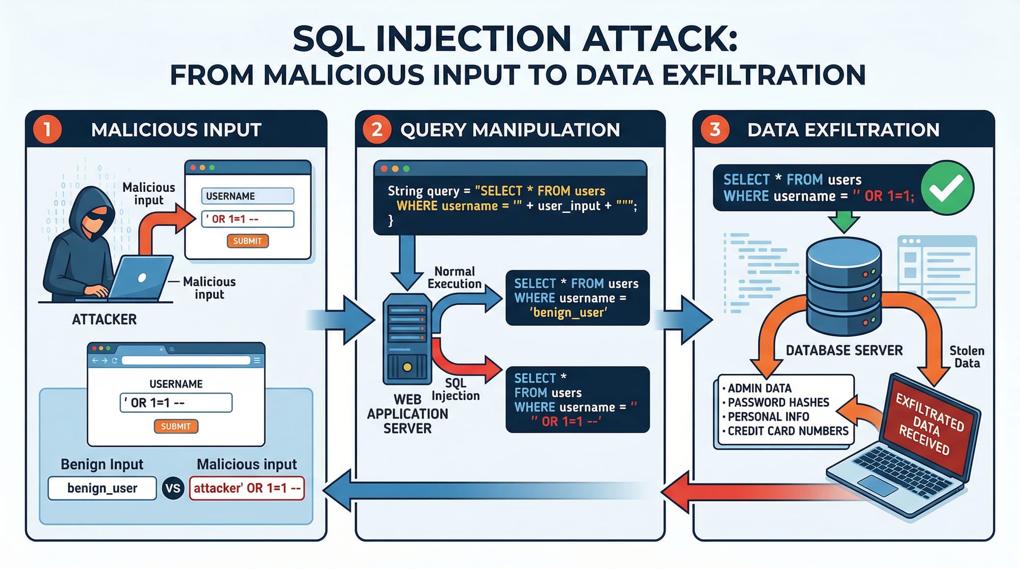 If a hacker inputs ' OR '1'='1, the query becomes: