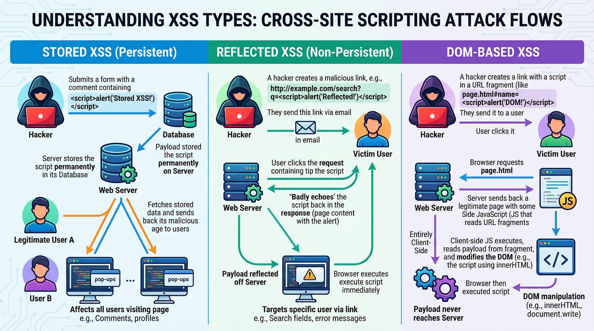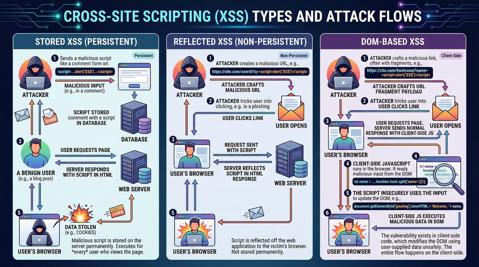 XSS occurs when an application outputs untrusted data to the browser. Attackers inject scripts to steal cookies or perform actions as another user.