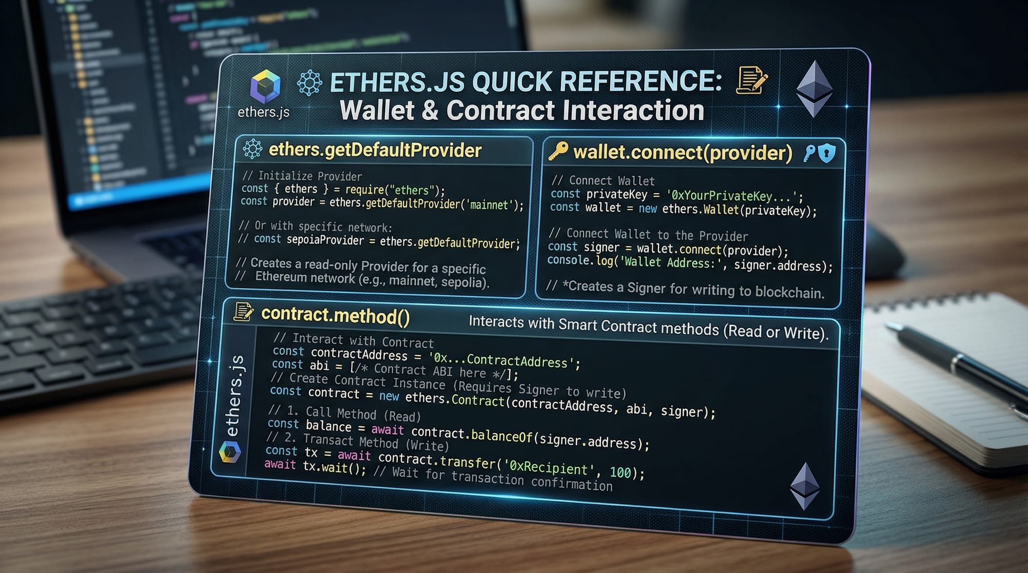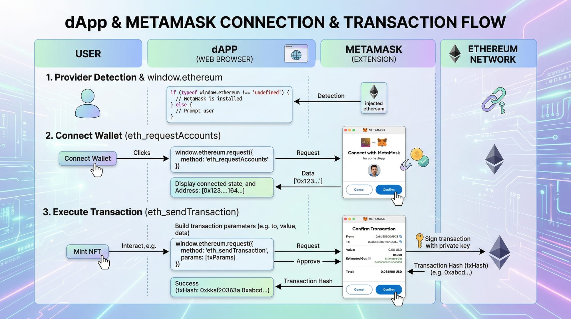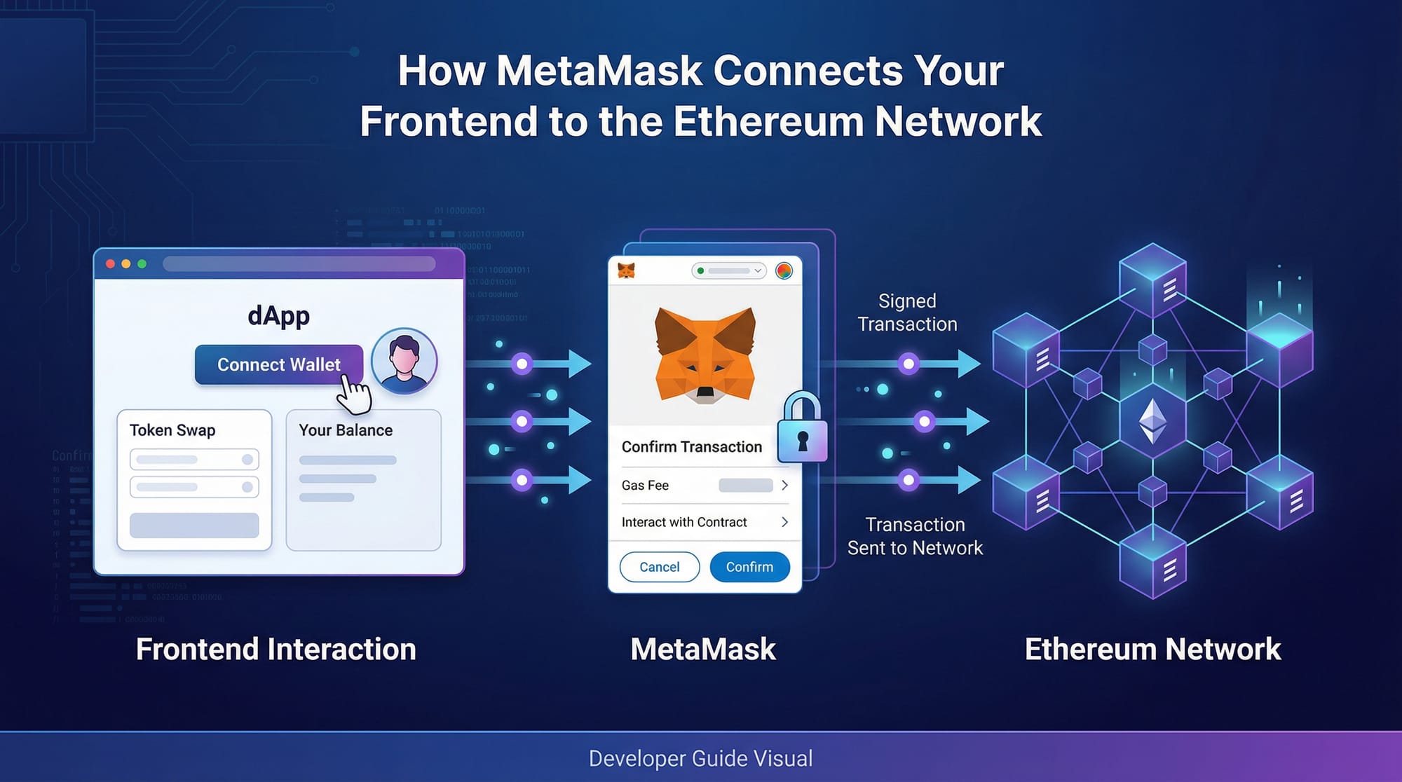 window.ethereum.request– Prompts MetaMask to connect.Web3Provider(window.ethereum)– Wraps the injected provider for Ethers.js.getSigner()– Returns a signer to send transactions.