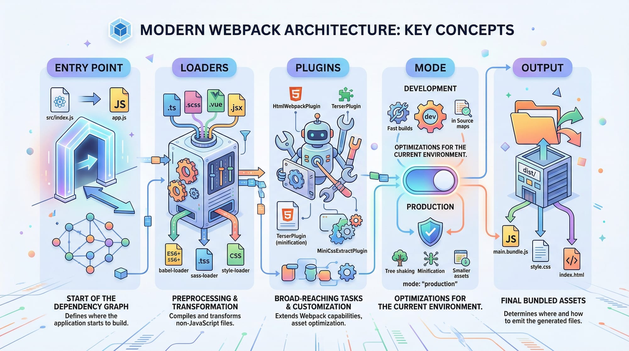 development→ Fast builds, includes source mapsproduction→ Optimized bundles, minified filesnone→ No optimizations