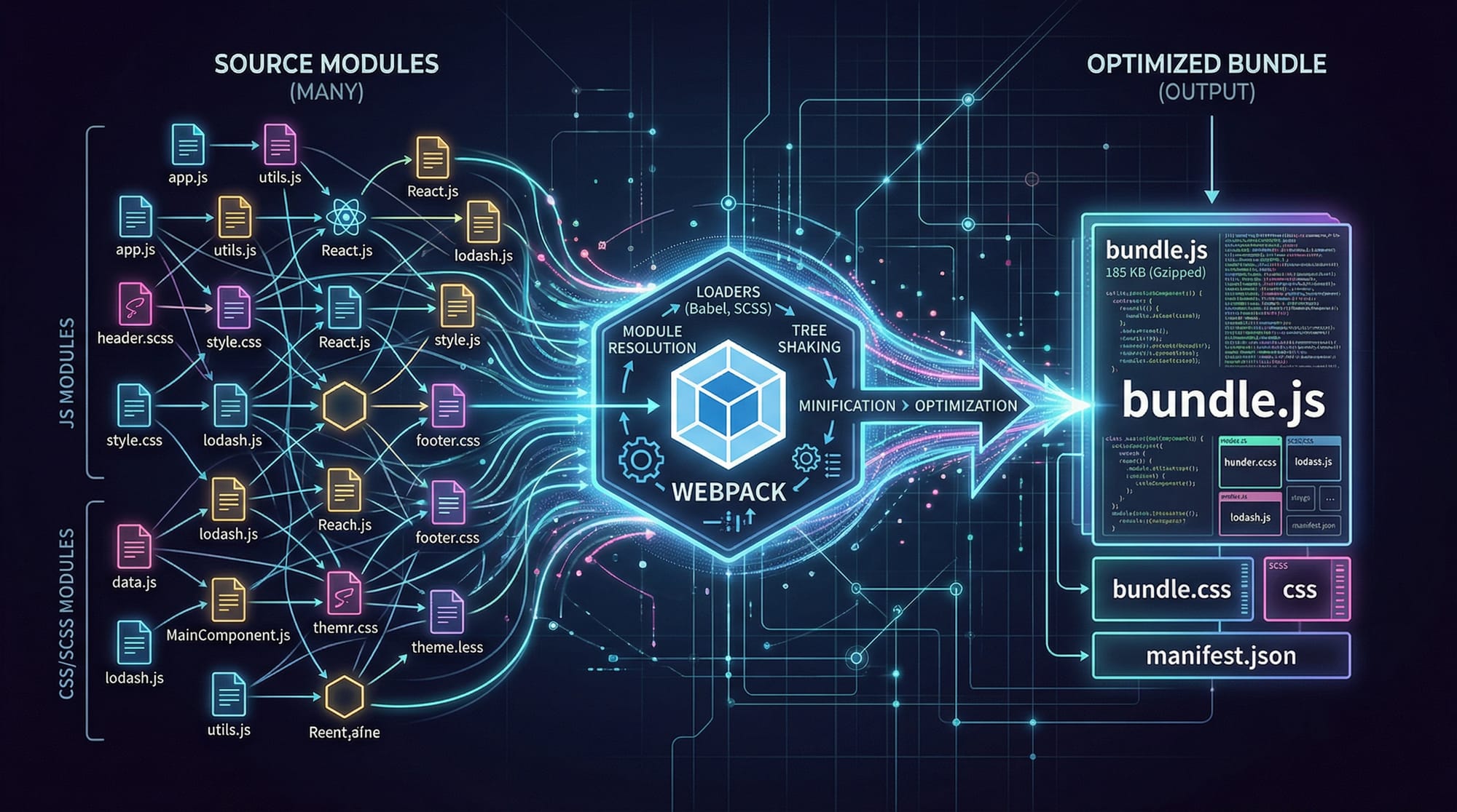 - Webpack bundles JS, CSS, and assets into optimized files