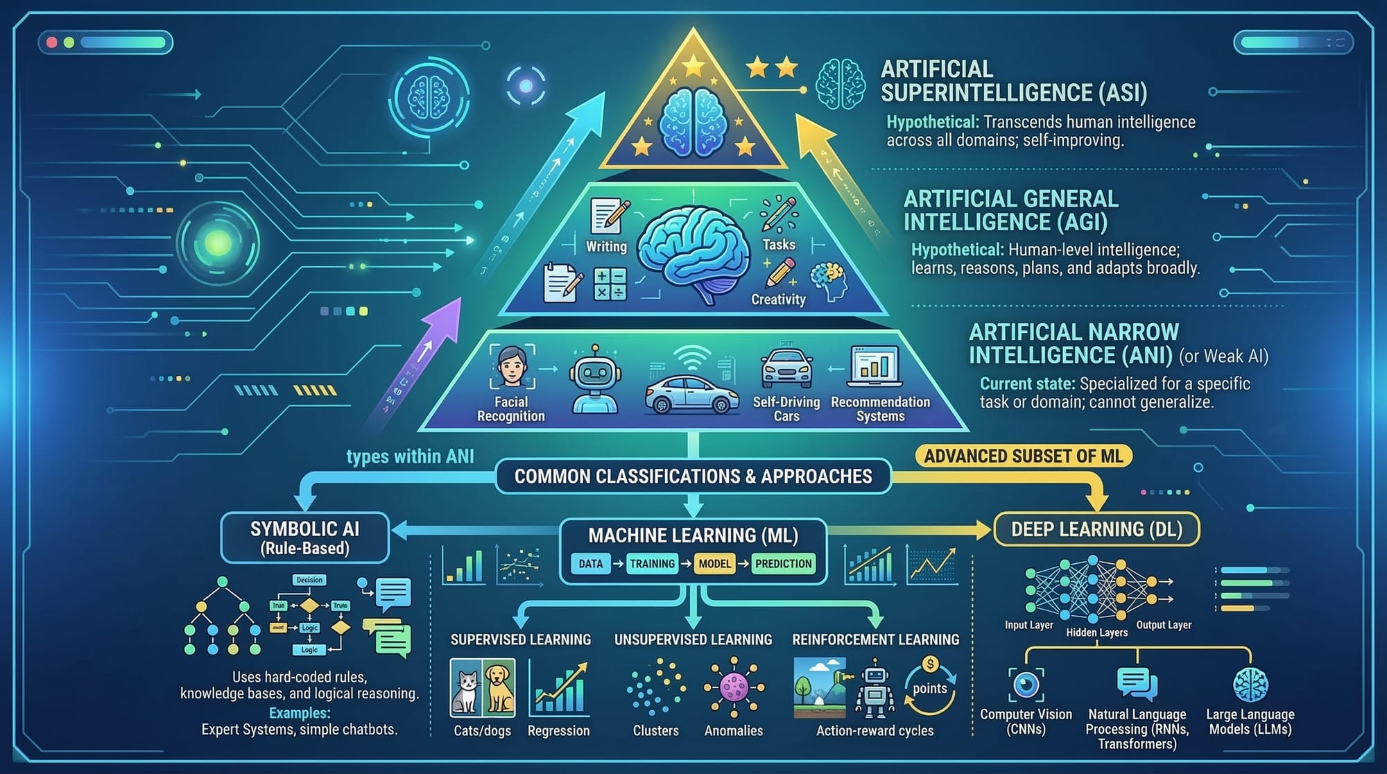 Narrow AI (task-specific), General AI (human-like intelligence), and Superintelligent AI (hypothetical).
